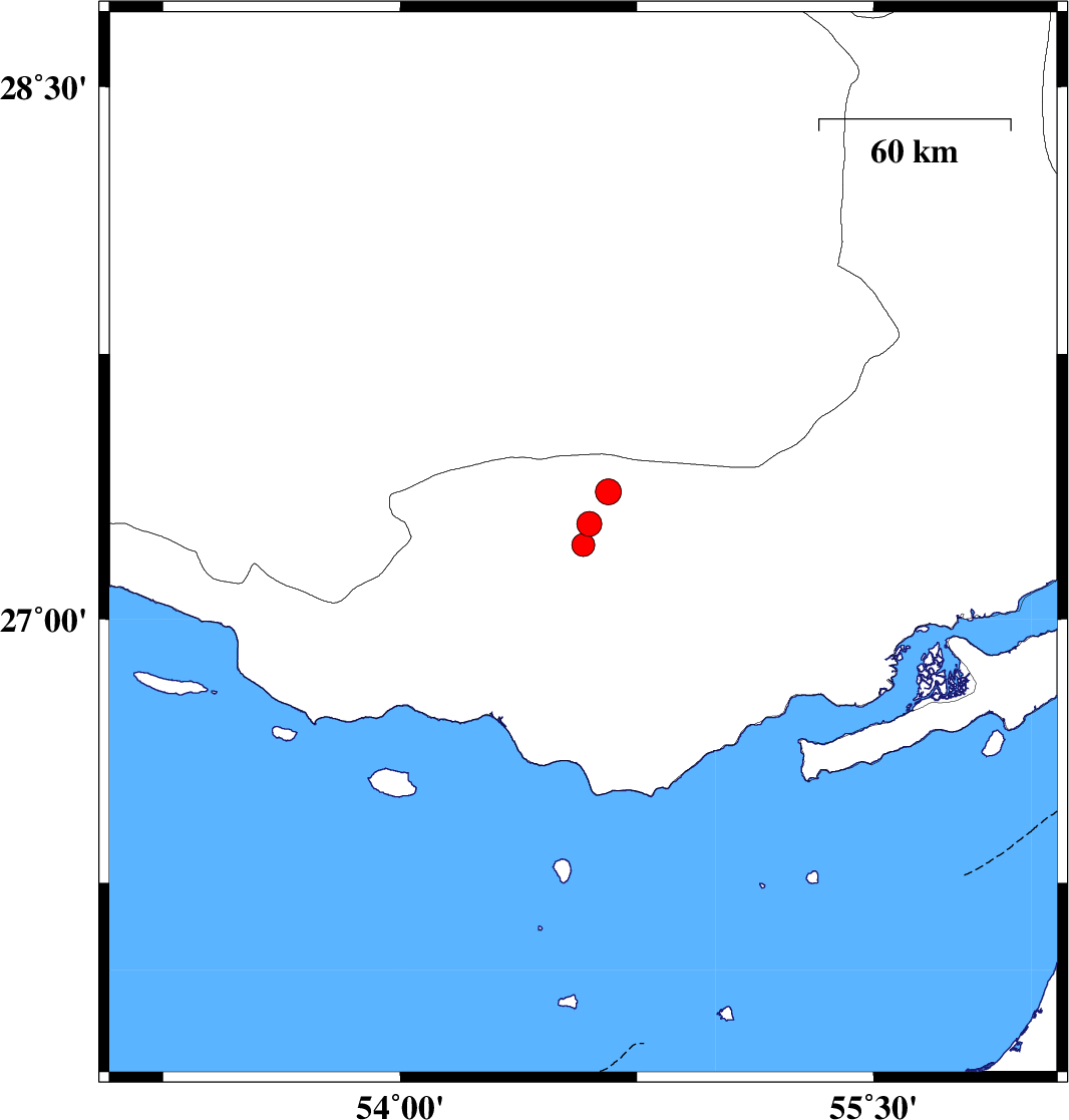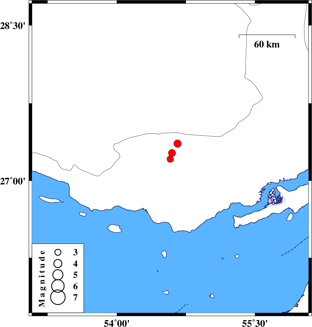 | 2020/10/26 | 17:28:14.1 | 20:58:14.1 | 27.36 | 54.66 | 10 | ML3.6 | Hormozgan Province, 34 km North-East of Bastak |