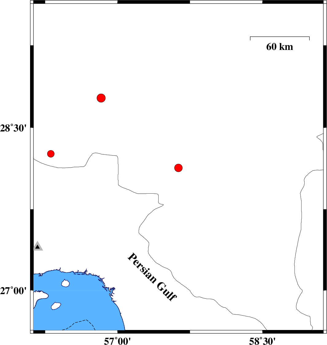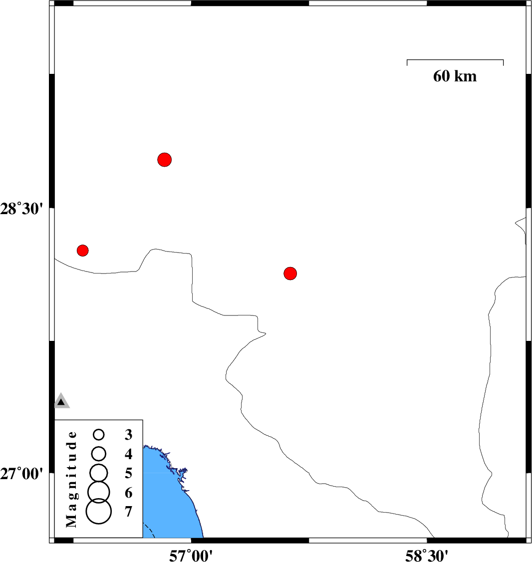 | 2020/11/05 | 16:56:00.1 | 20:26:00.1 | 28.13 | 57.63 | 20 | ML3.6 | Kerman Province, 21 km North of Kahnuj | ||