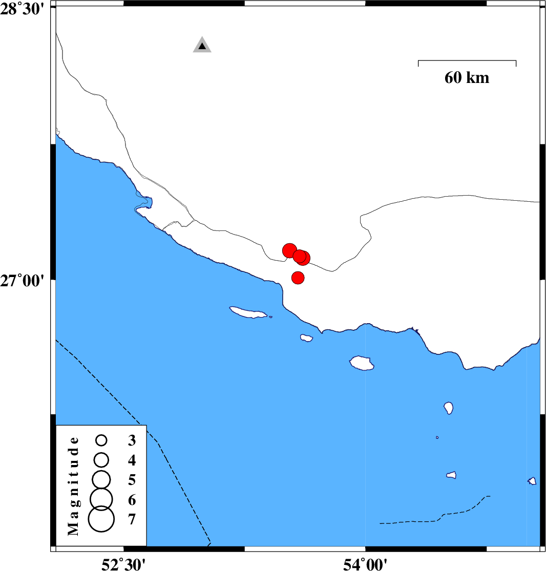 | 2020/11/08 | 21:51:20.3 | 01:21:20.3 | 27.13 | 53.59 | 19 | ML3.7 | Fars Province, 48 km South-East of Lamerd | ||
