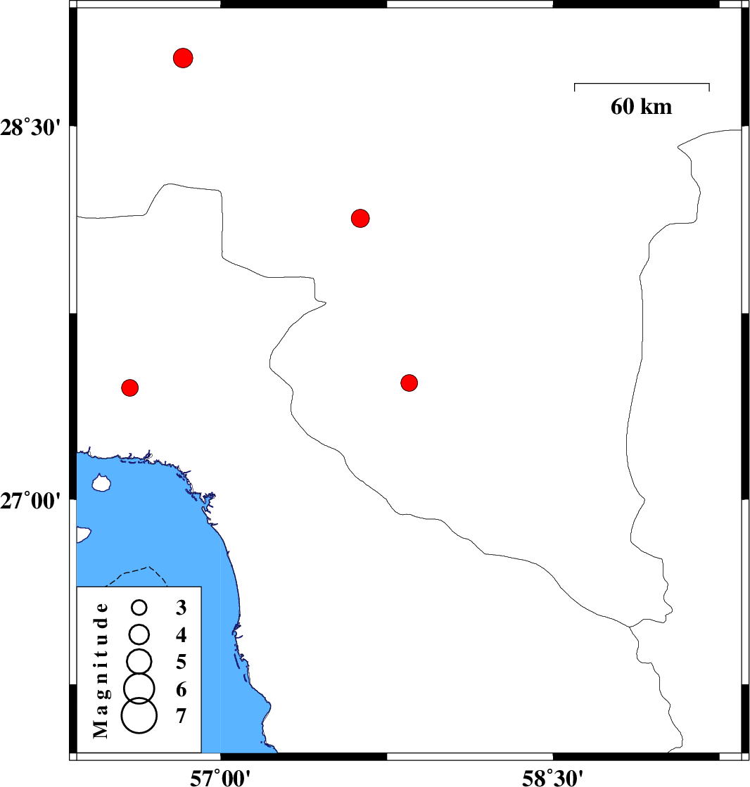 | 2020/11/05 | 16:56:00.1 | 20:26:00.1 | 28.13 | 57.63 | 20 | ML3.6 | Kerman Province, 21 km North of Kahnuj | ||