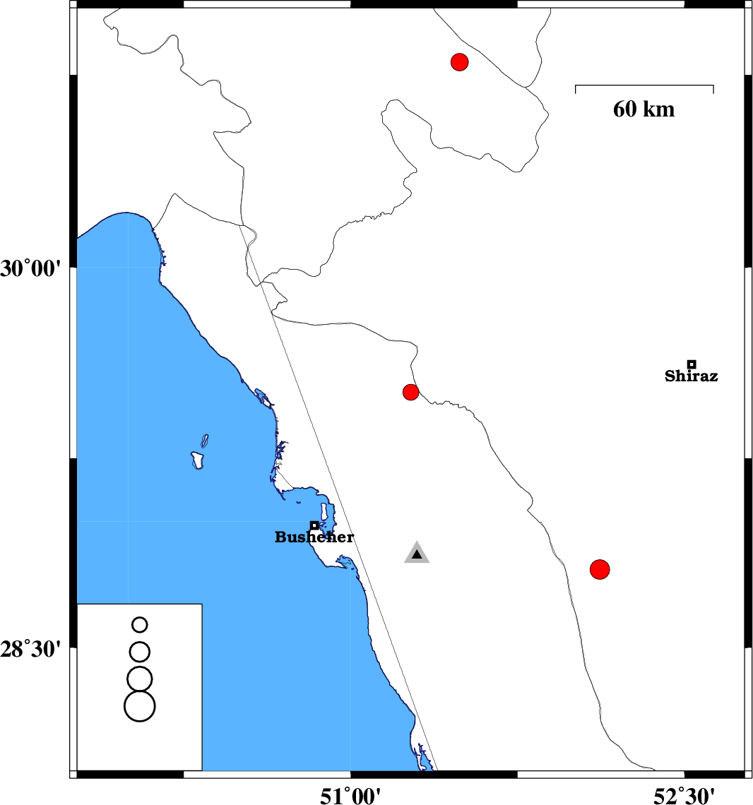 | 2020/12/13 | 00:33:56.6 | 04:03:56.6 | 29.51 | 51.27 | 10 | ML3.3 | Bushehr Province, 28 km North of Borazjan | ||