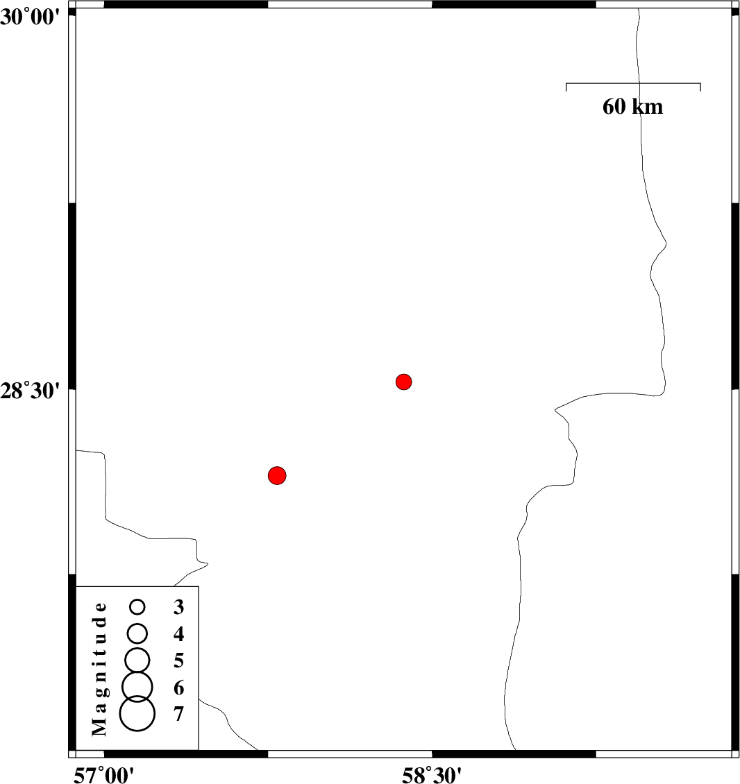 | 2020/12/04 | 20:40:27.3 | 00:10:27.3 | 28.15 | 57.79 | 10 | ML3.6 | Kerman Province, 24 km North of Kahnuj |