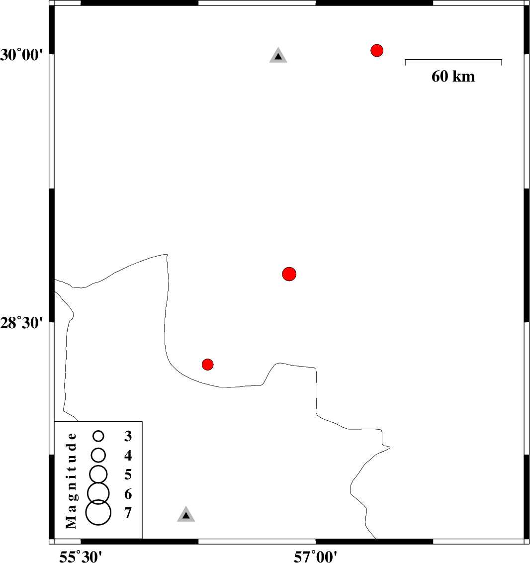 | 2020/11/02 | 22:32:13.3 | 02:02:13.3 | 28.26 | 56.31 | 15 | ML3.2 | Kerman Province, 40 km -East of Hajiabad |