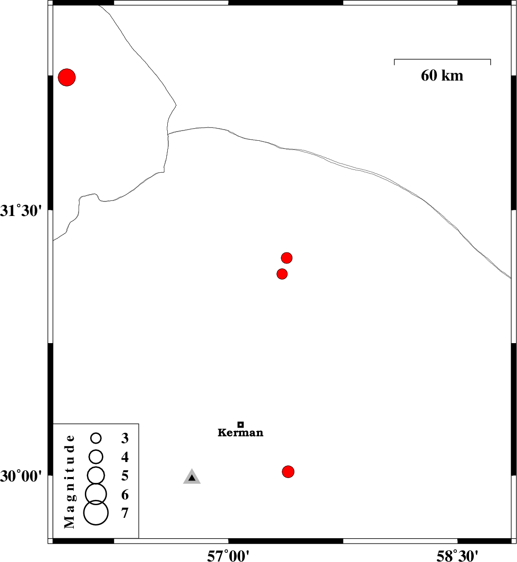 | 2020/10/12 | 07:42:28.2 | 11:12:28.2 | 31.23 | 57.38 | 10 | ML3.2 | Kerman Province, 54 km -East of Ravar |