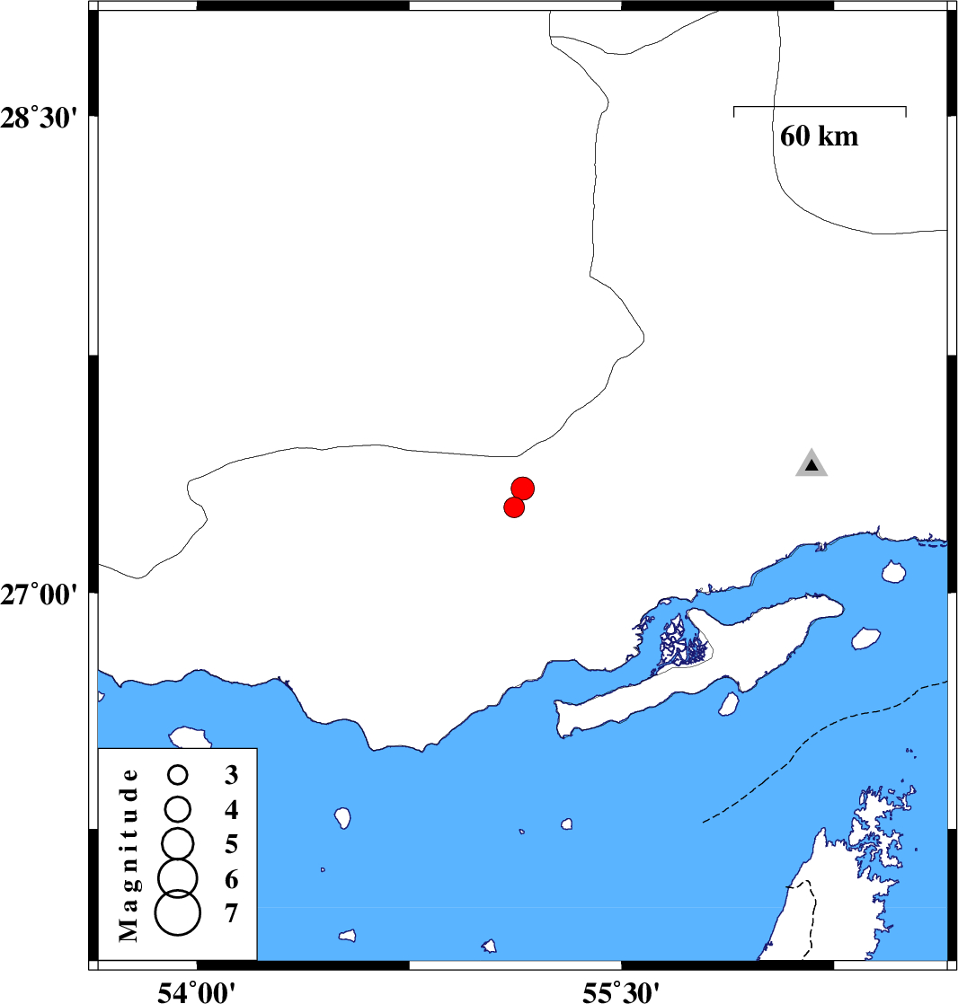 | 2021/01/03 | 09:43:46.4 | 13:13:46.4 | 27.33 | 55.15 | 10 | ML3.7 | Hormozgan Province, 79 km North-East of Bastak |