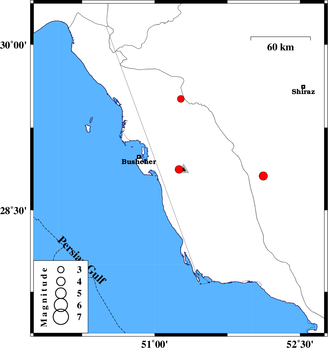 | 2020/12/13 | 00:33:56.6 | 04:03:56.6 | 29.51 | 51.27 | 10 | ML3.3 | Bushehr Province, 28 km North of Borazjan | ||
