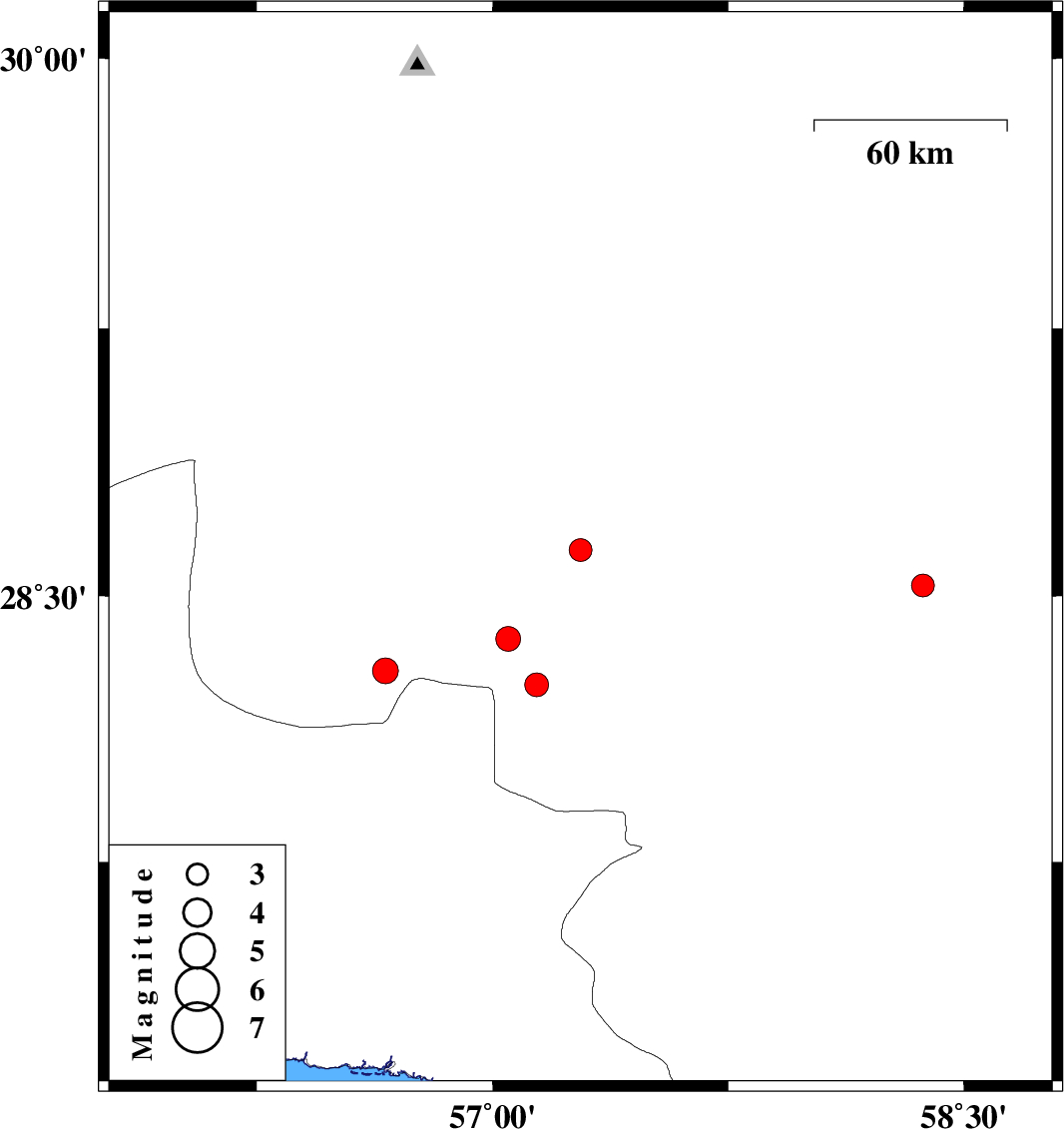 | 2020/12/22 | 21:29:46.2 | 00:59:46.2 | 28.53 | 58.37 | 10 | ML3.3 | Kerman Province, 64 km South of Bam |