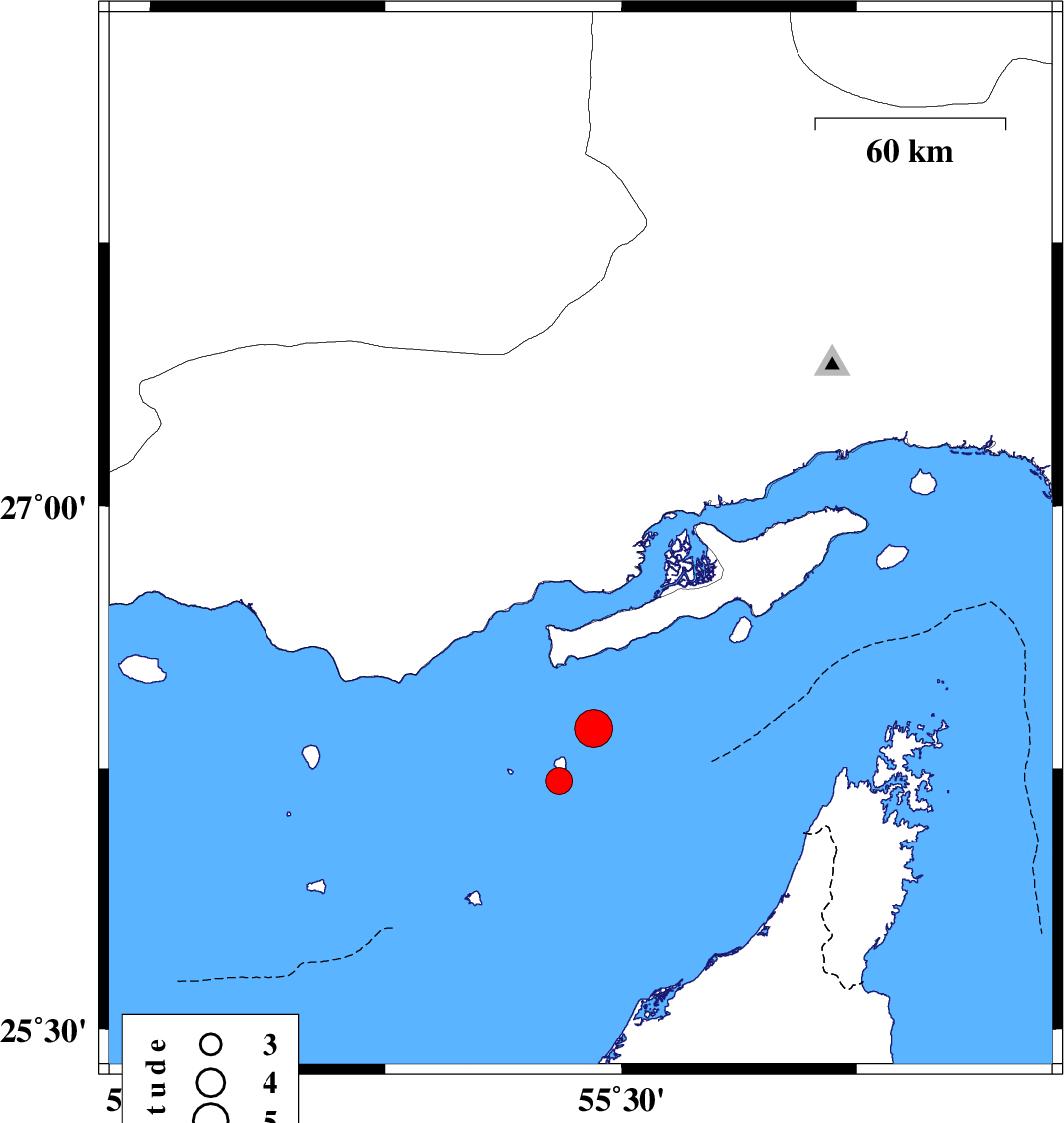 | 2021/01/15 | 23:24:20.8 | 02:54:20.8 | 26.75 | 55.26 | 29 | ML3.8 | Persian Gulf, 48 km North-East of Bandar-e lengeh | ||