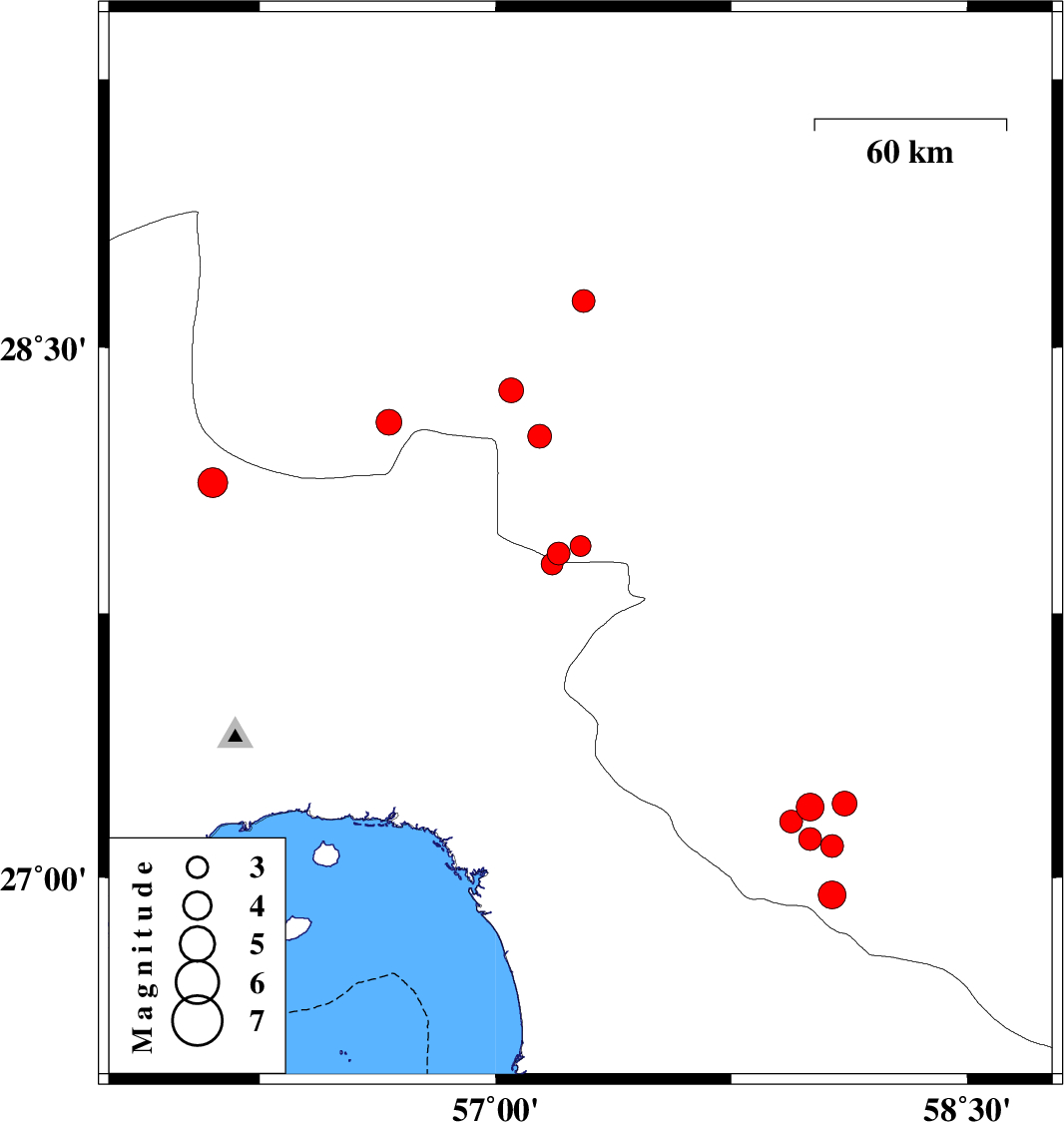 2021/01/07 05:22:41.1 08:52:41.1 27.115810 ML3.3 Kerman Province, 60 km South-East of Manujan