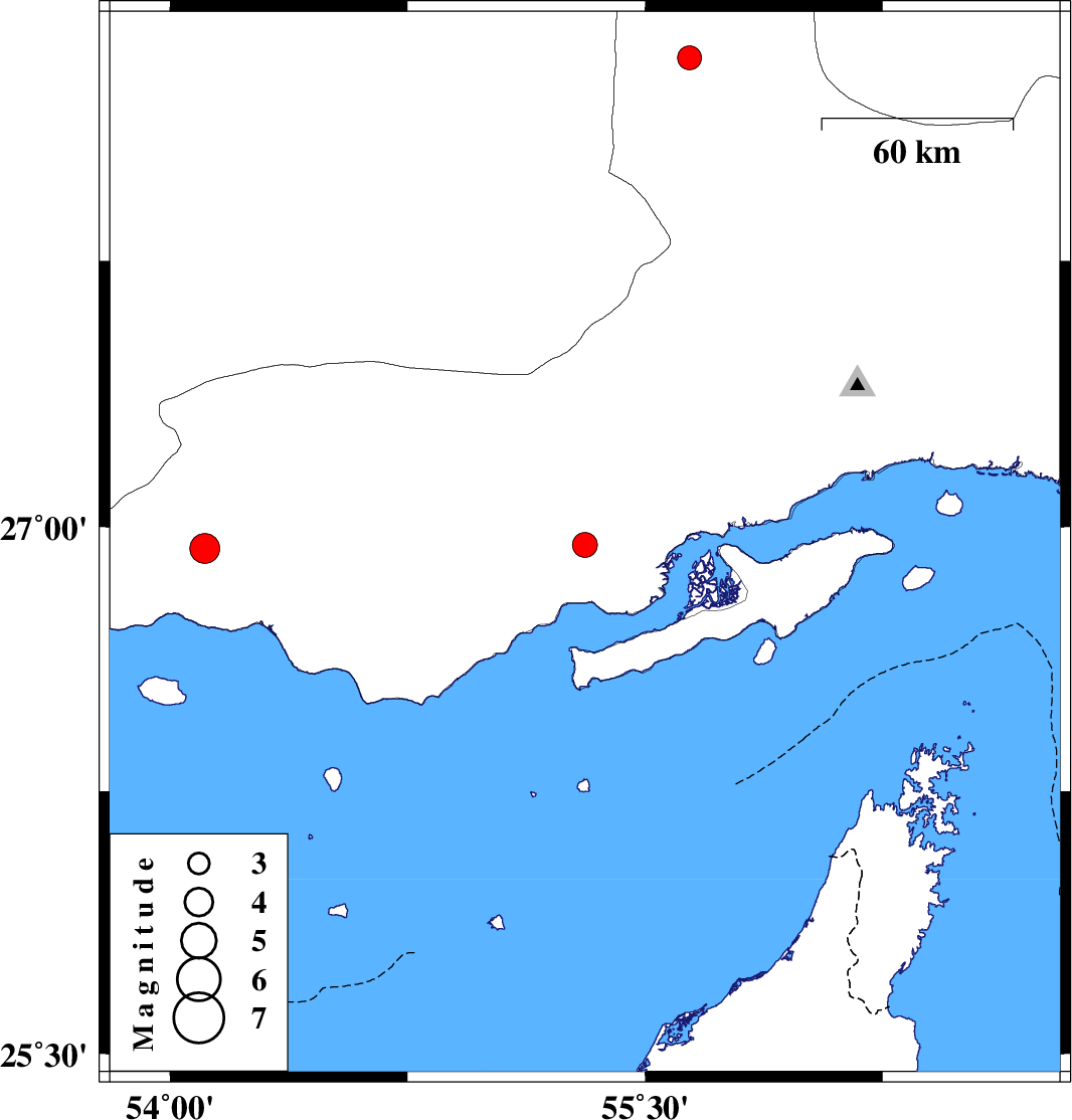 | 2021/01/30 | 09:31:09.9 | 13:01:09.9 | 26.95 | 55.31 | 21 | ML3.5 | Hormozgan Province, 66 km North-East of Bandar-e lengeh | ||