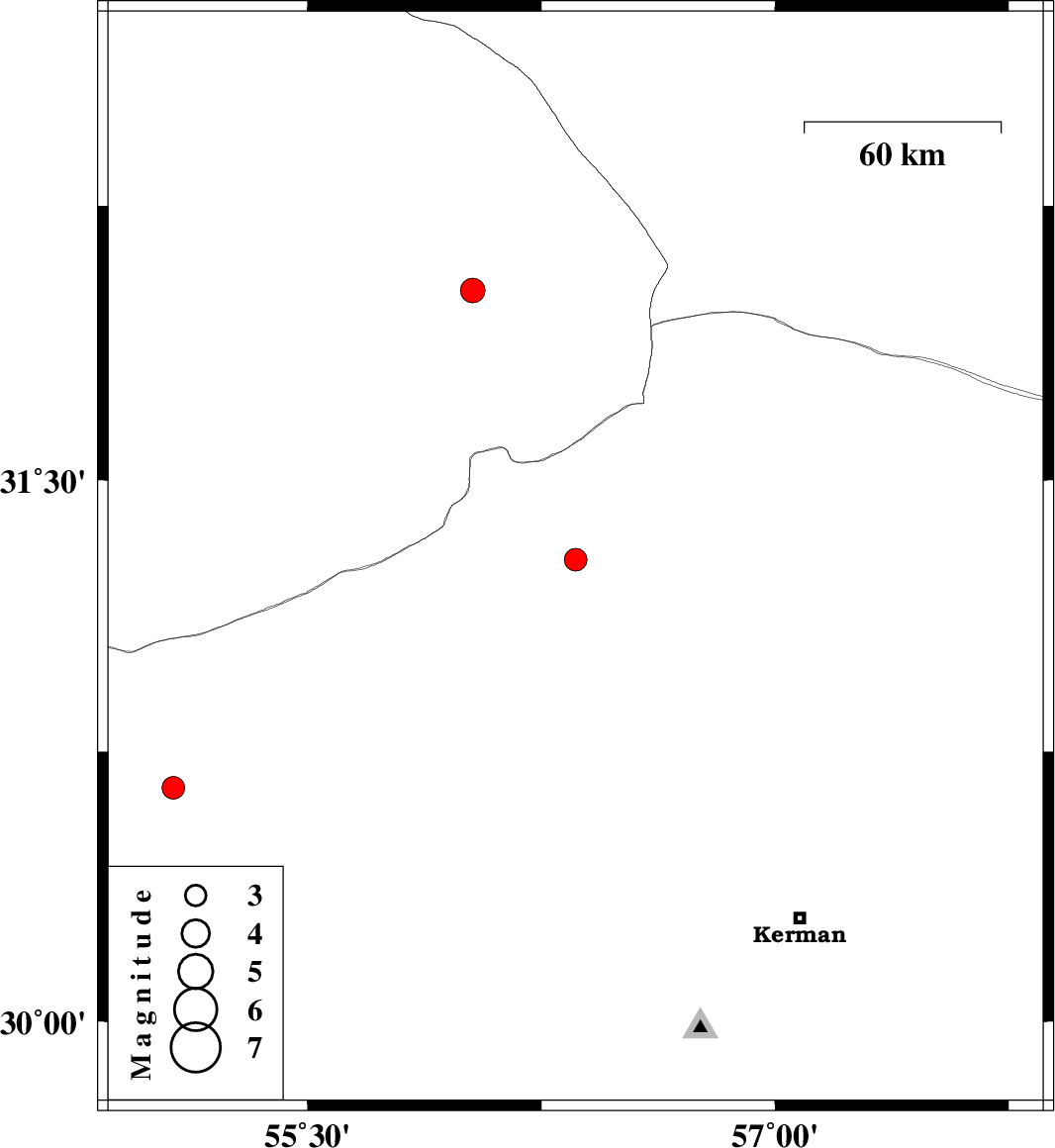 | 2021/01/29 | 13:36:10.3 | 17:06:10.3 | 30.65 | 55.07 | 10 | ML3.2 | Kerman Province, 60 km North of Shahr-e babak |