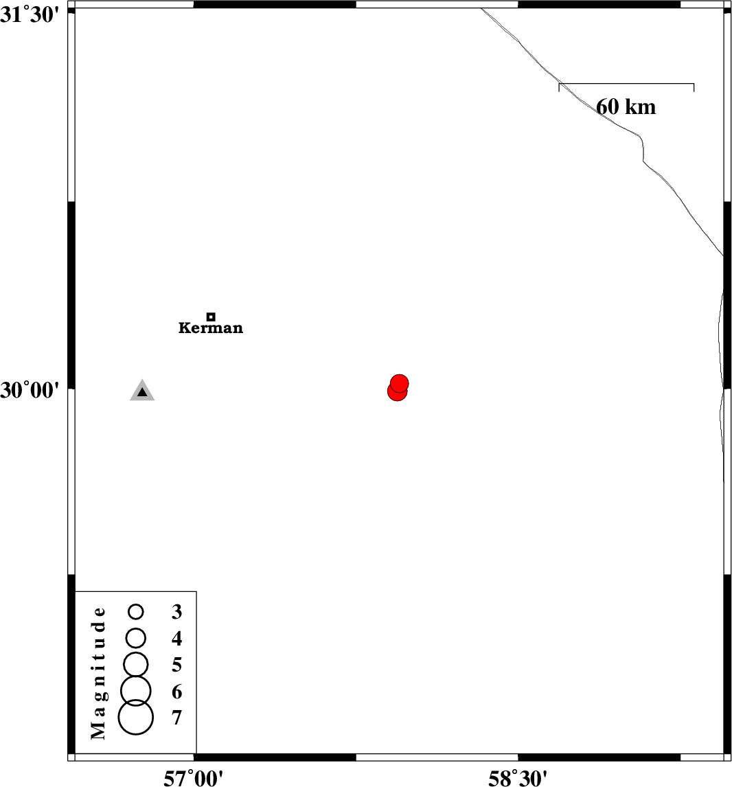 | 2021/02/03 | 07:22:30.2 | 10:52:30.2 | 29.99 | 57.94 | 10 | ML4.1 | Kerman Province, 89 km South-East of Kerman |
