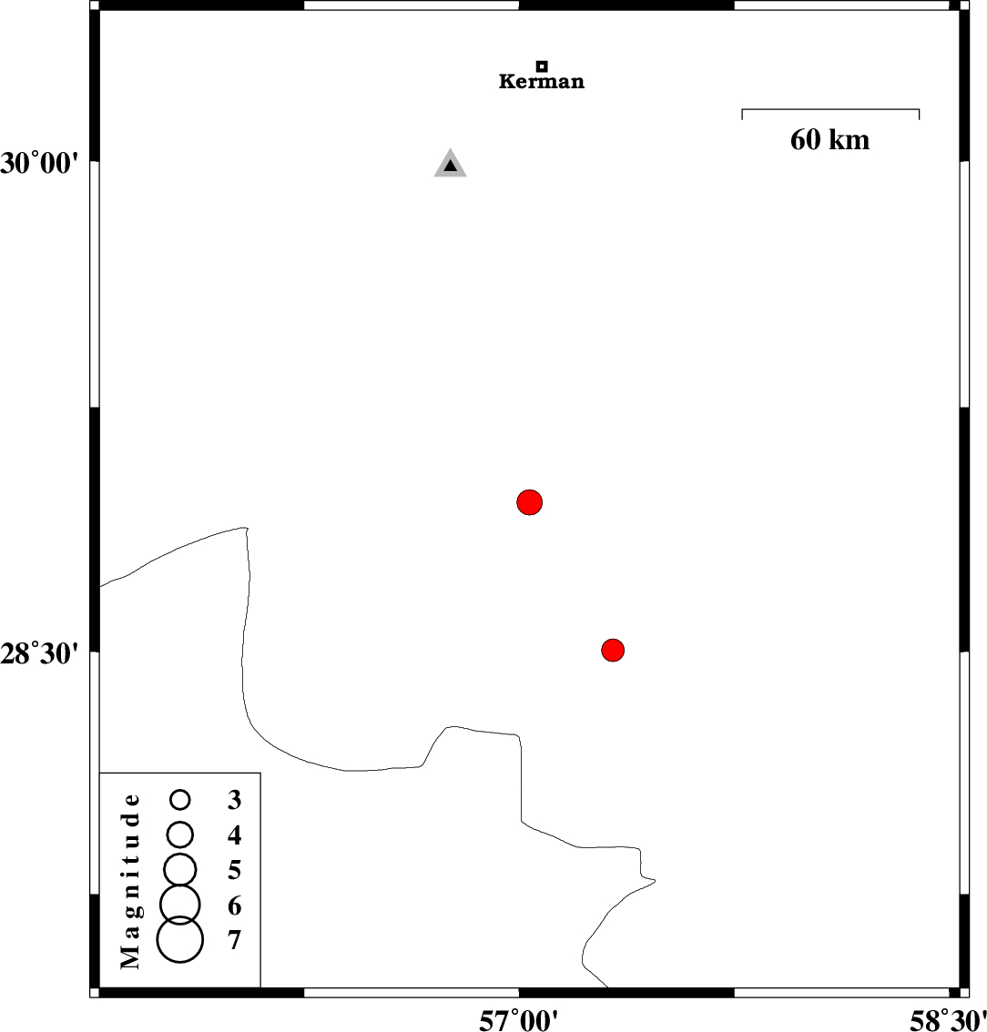 | 2021/04/11 | 15:33:57.4 | 20:03:57.4 | 28.503 | 57.326 | 12 | ML3.5 | Kerman Province, 44 km South-West of Jiroft |
