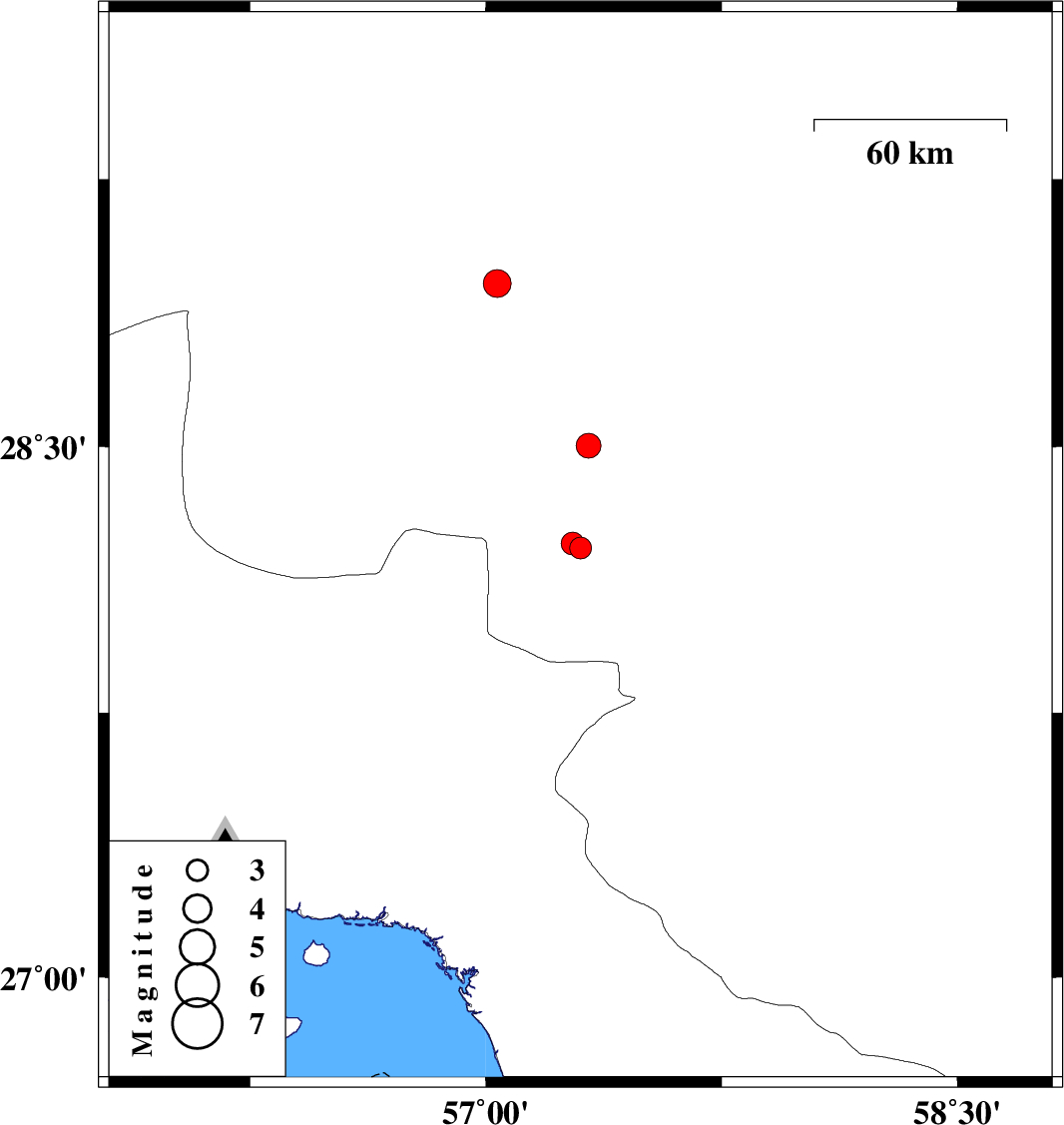 | 2021/04/11 | 15:33:57.4 | 20:03:57.4 | 28.503 | 57.326 | 12 | ML3.5 | Kerman Province, 44 km South-West of Jiroft |