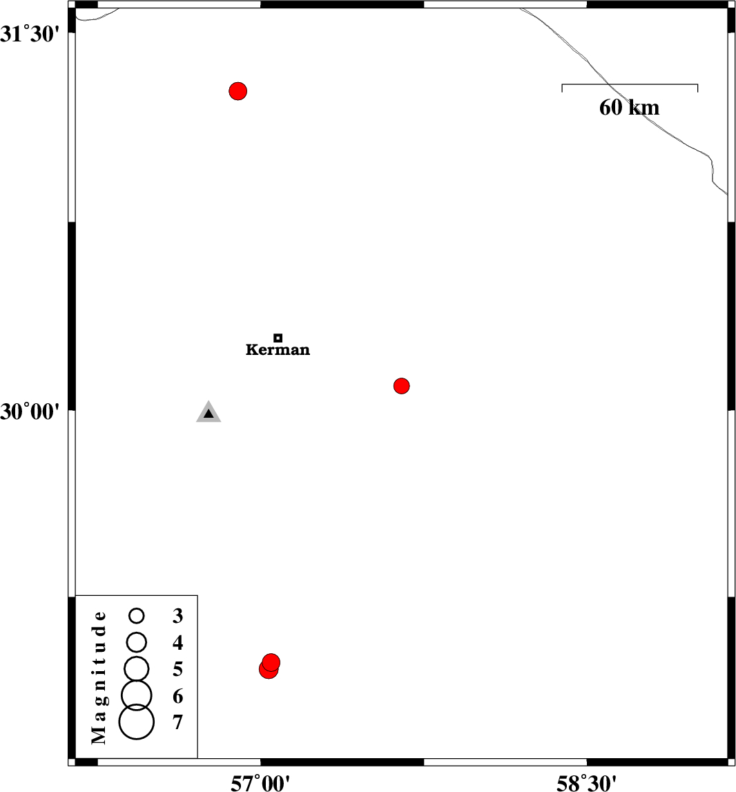 | 2021/04/11 | 17:26:57.4 | 21:56:57.4 | 28.958 | 57.036 | 20 | ML4 | Kerman Province, 52 km South-East of Baft |
