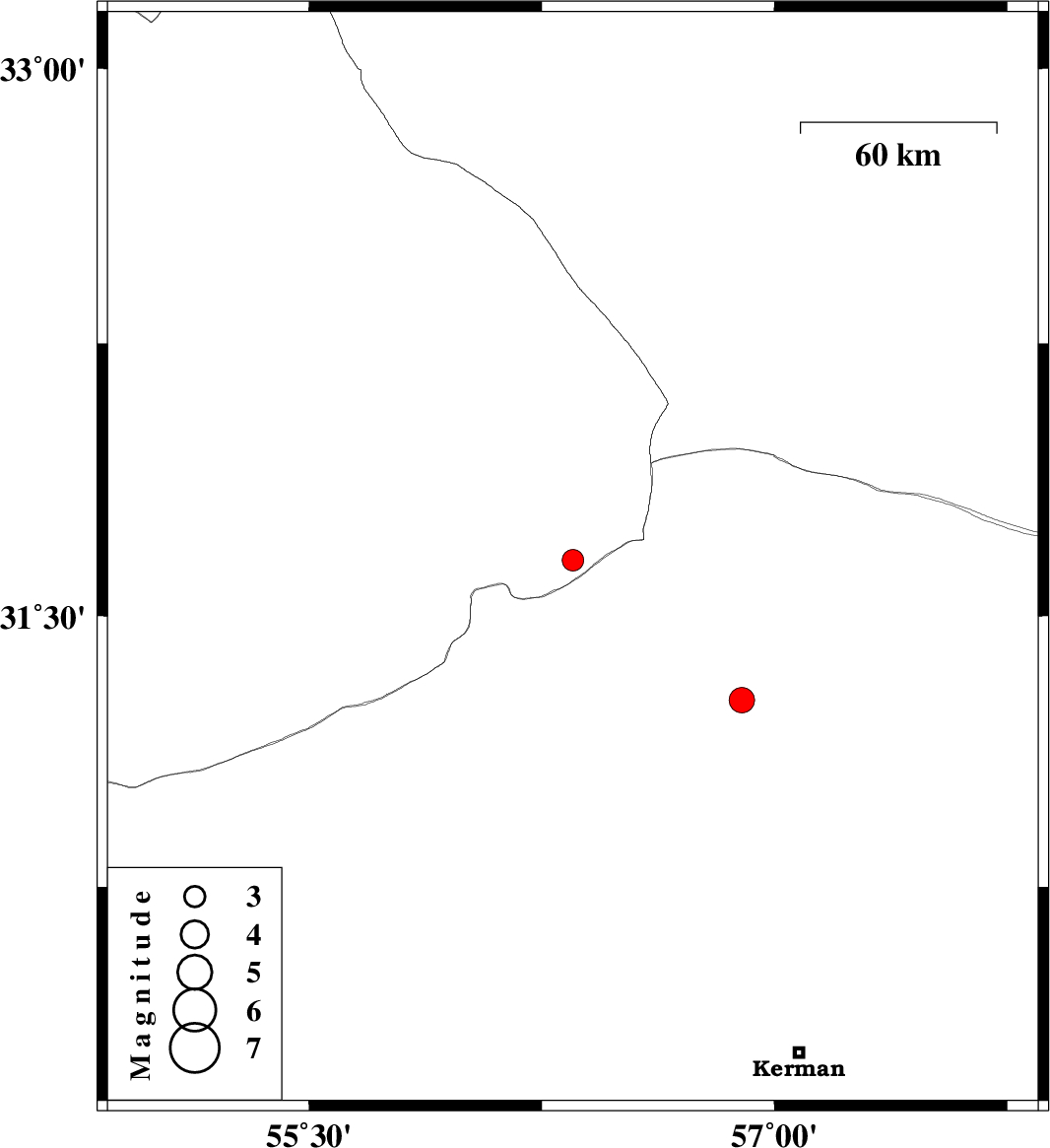 | 2021/05/09 | 23:58:01.3 | 04:28:01.3 | 31.654 | 56.35 | 12 | ML3.1 | Yazd Province, 61 km North-West of Ravar | ||