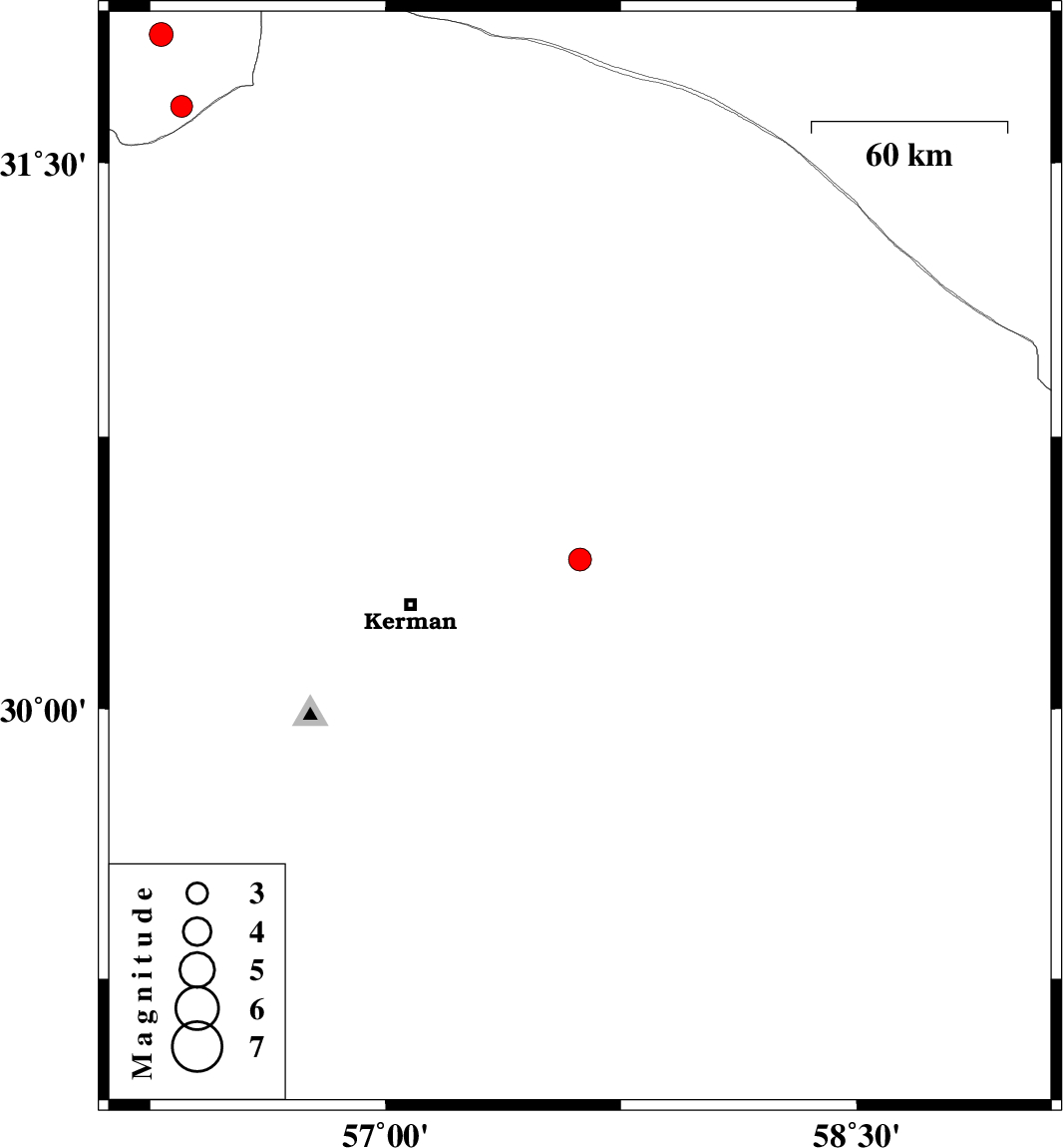 | 2021/05/24 | 23:04:51.9 | 03:34:51.9 | 30.412 | 57.619 | 18 | ML3.2 | Kerman Province, 54 km North-East of Kerman | ||