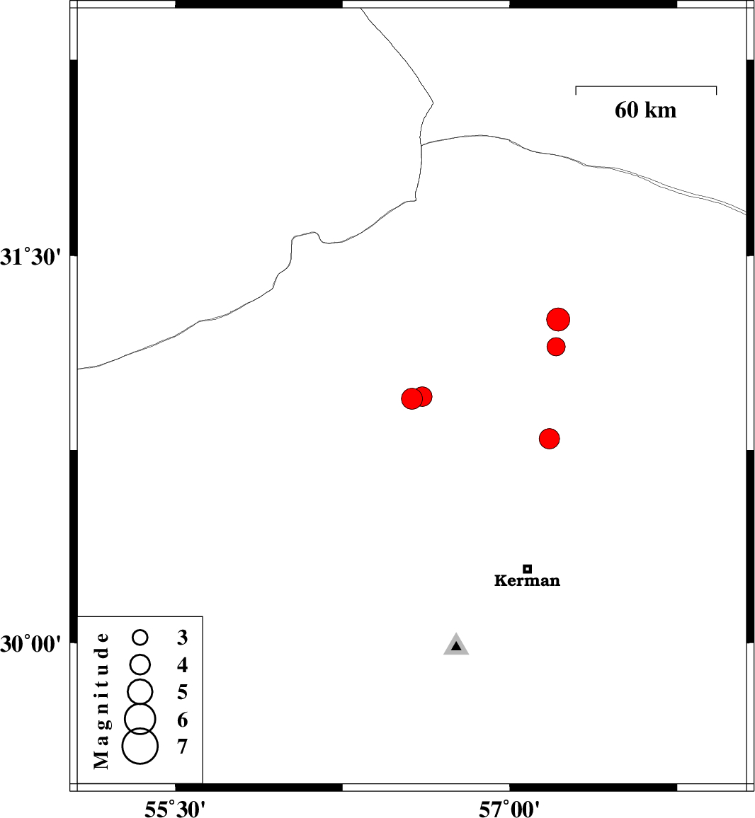 | 2021/06/12 | 21:37:51.1 | 02:07:51.1 | 30.793 | 57.177 | 12 | ML4.1 | Kerman Province, 57 km North of Kerman | ||