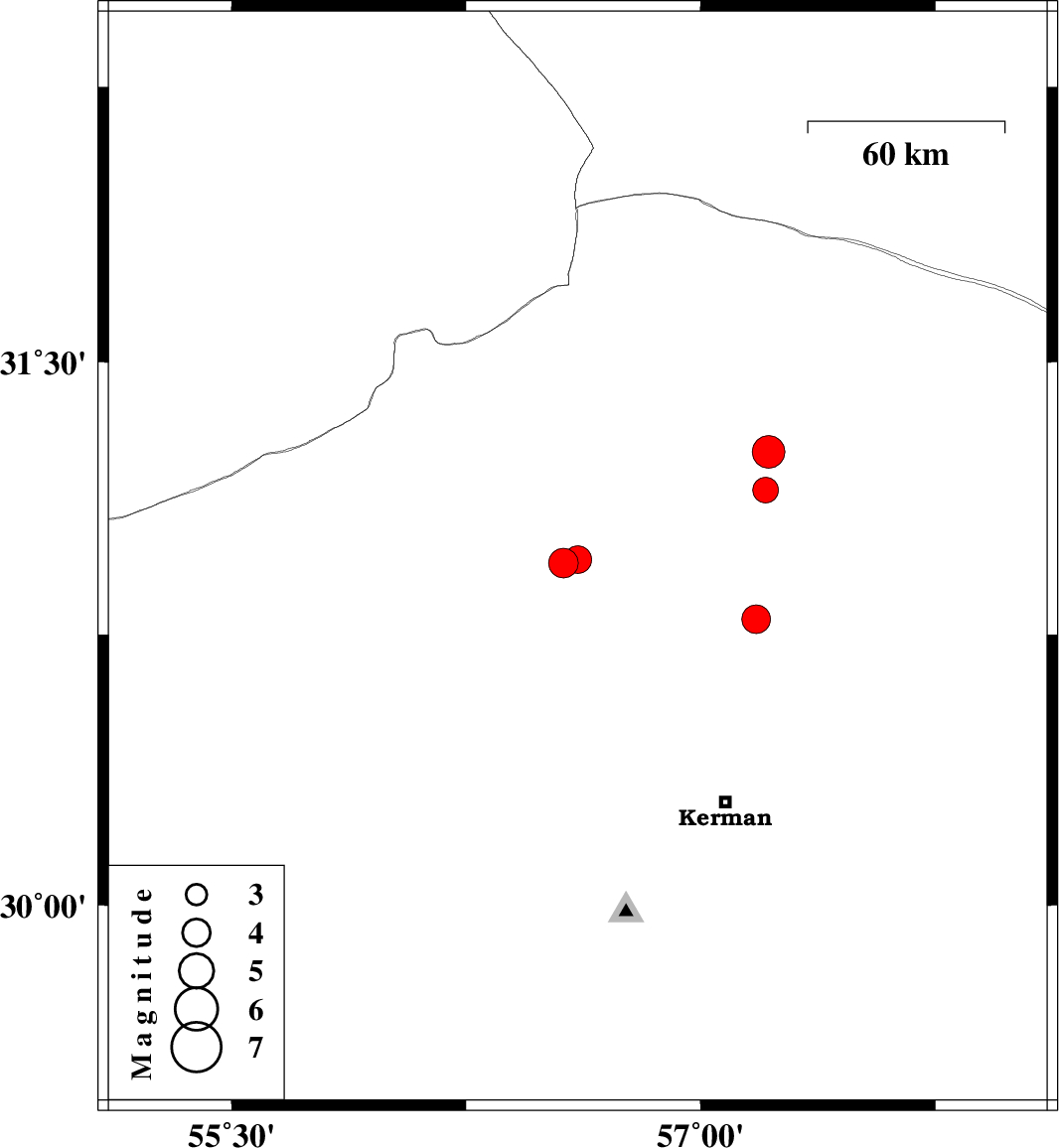 | 2021/06/12 | 21:37:51.1 | 02:07:51.1 | 30.793 | 57.177 | 12 | ML4.1 | Kerman Province, 57 km North of Kerman | ||