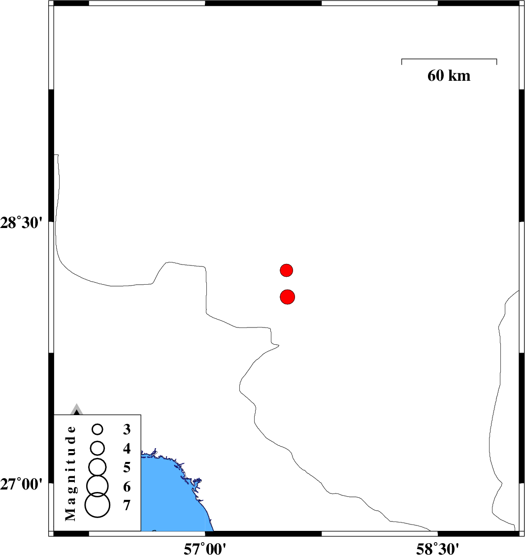 | 2021/07/05 | 07:37:15.9 | 12:07:15.9 | 28.222 | 57.523 | 12 | ML3.7 | Kerman Province, 35 km North-West of Kahnuj |