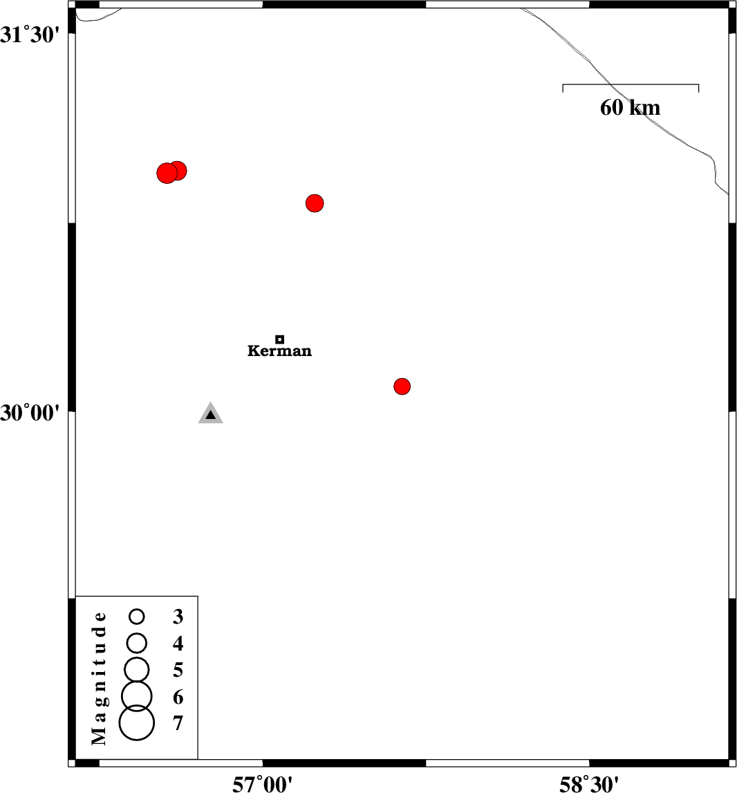 | 2021/07/01 | 14:06:17.1 | 18:36:17.1 | 30.957 | 56.607 | 23 | ML3.9 | Kerman Province, 17 km North of Zarand |