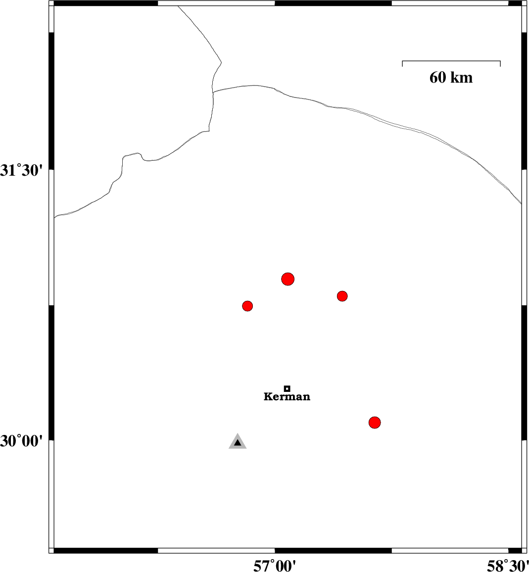 | 2021/08/03 | 17:27:50.3 | 21:57:50.3 | 30.896 | 57.083 | 12 | ML3.7 | Kerman Province, 50 km -East of Zarand | ||