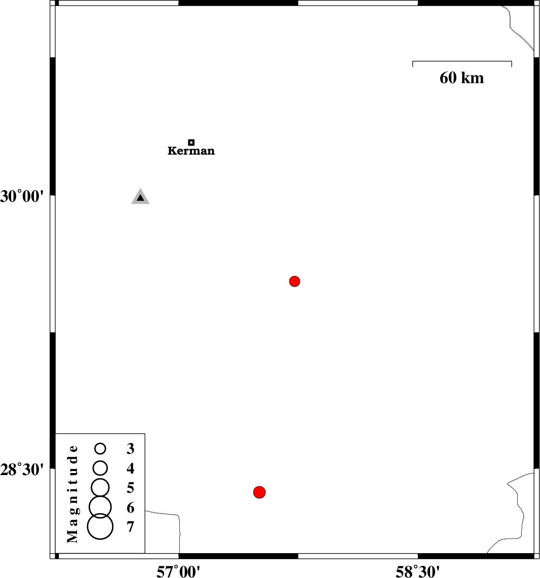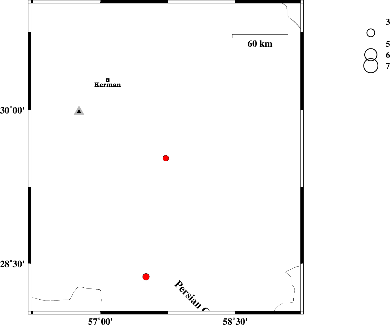 | 2021/08/14 | 09:15:02.7 | 13:45:02.7 | 28.368 | 57.507 | 9 | ML3.4 | Kerman Province, 40 km South-West of Jiroft |