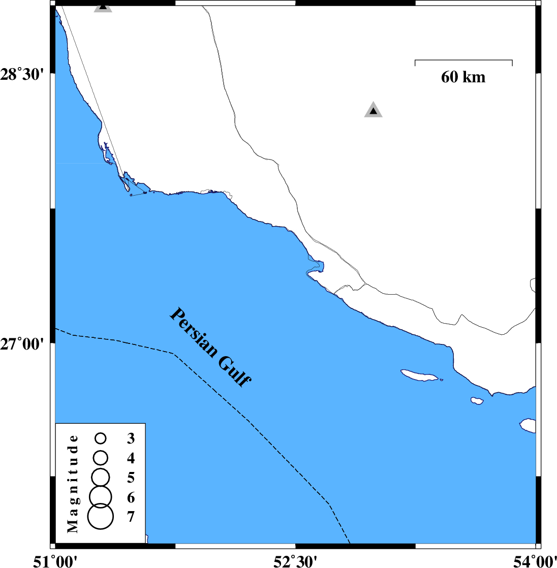 | 2021/09/19 | 22:11:08.1 | 02:41:08.1 | 27.372 | 52.5 | 12 | ML3.5 | Persian Gulf, 43 km South-West of Mehr |