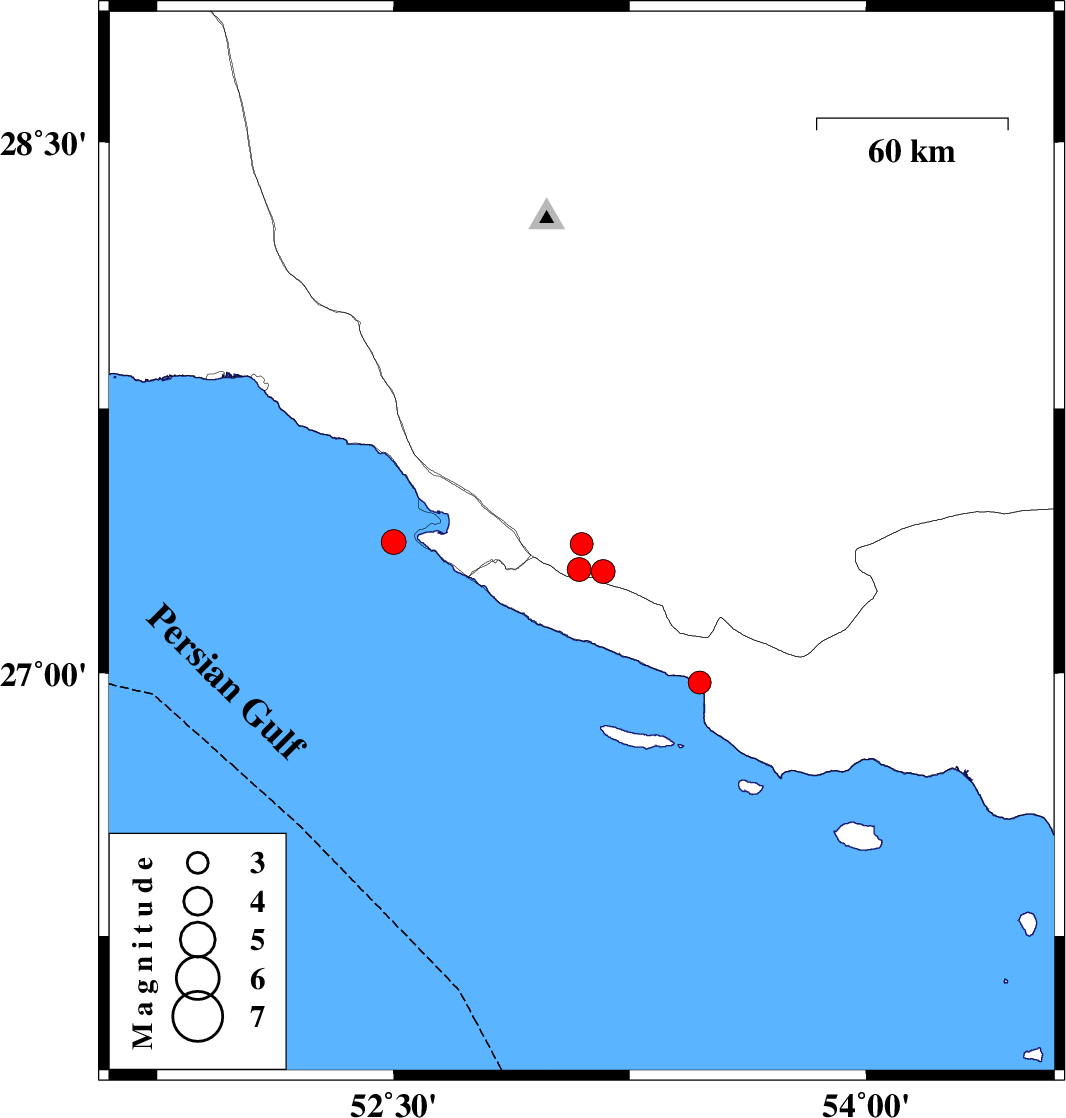 | 2021/09/19 | 22:11:08.1 | 02:41:08.1 | 27.372 | 52.5 | 12 | ML3.5 | Persian Gulf, 43 km South-West of Mehr | ||