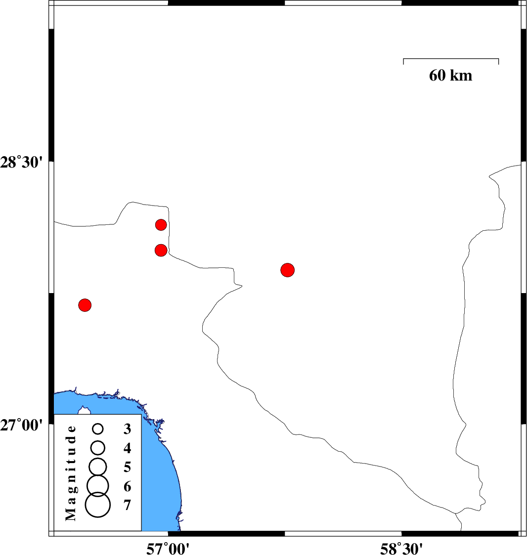 | 2021/09/21 | 08:07:52.6 | 12:37:52.6 | 27.882 | 57.767 | 12 | ML3.9 | Kerman Province, 10 km of Kahnuj | ||