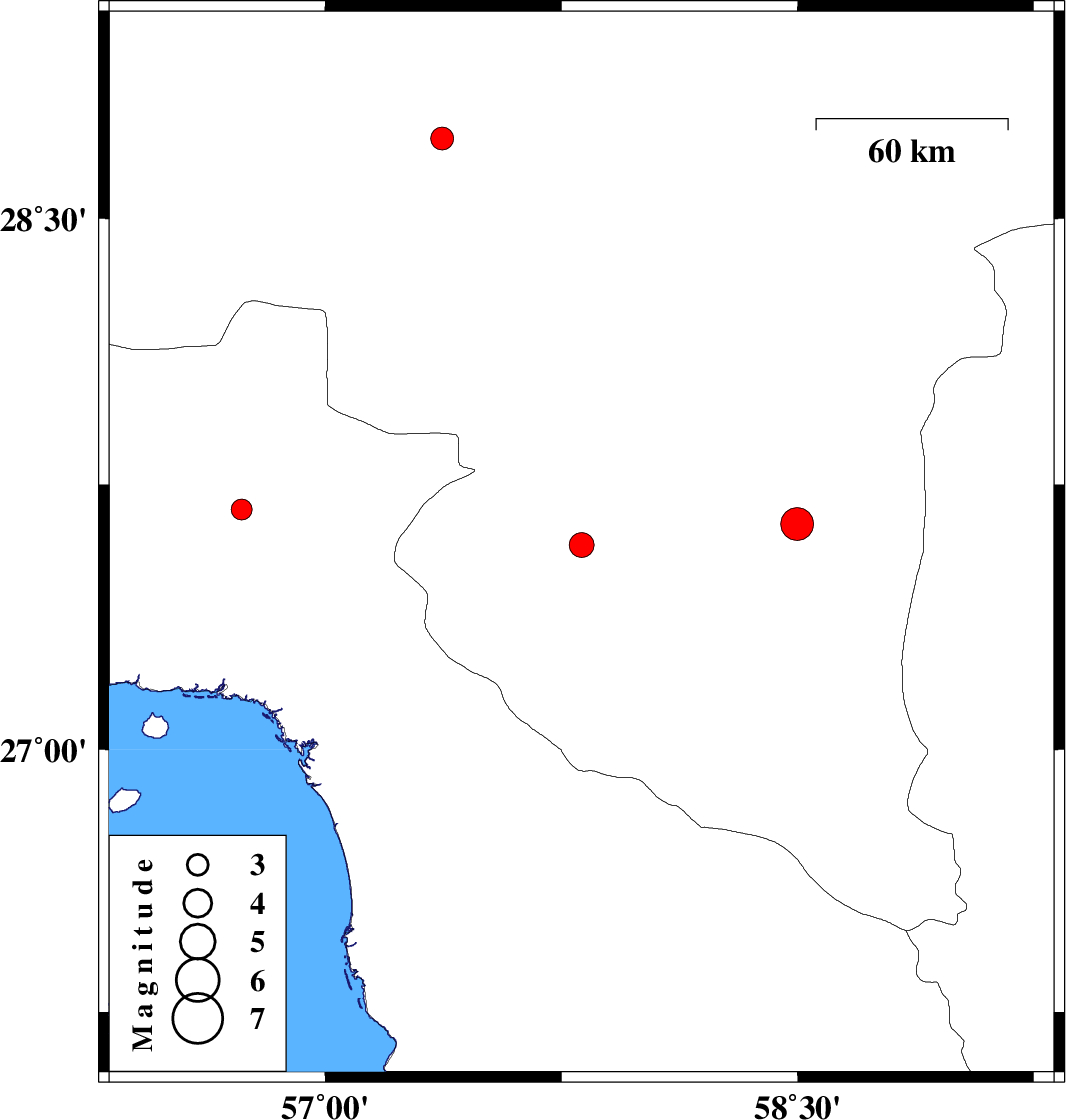 | 2021/10/23 | 05:40:09.9 | 09:10:09.9 | 27.58 | 57.814 | 16 | ML3.5 | Kerman Province, 37 km North-East of Manujan | ||