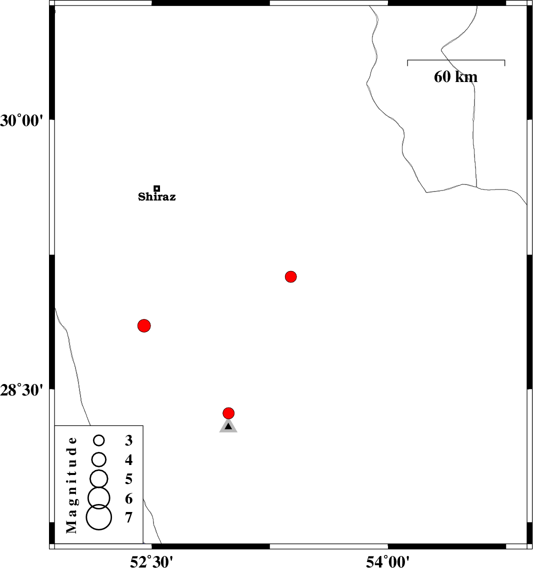 | 2021/10/08 | 10:13:25.8 | 13:43:25.8 | 28.043 | 52.306 | 15 | ML3.6 | Fars Province, 23 km North of Jam |