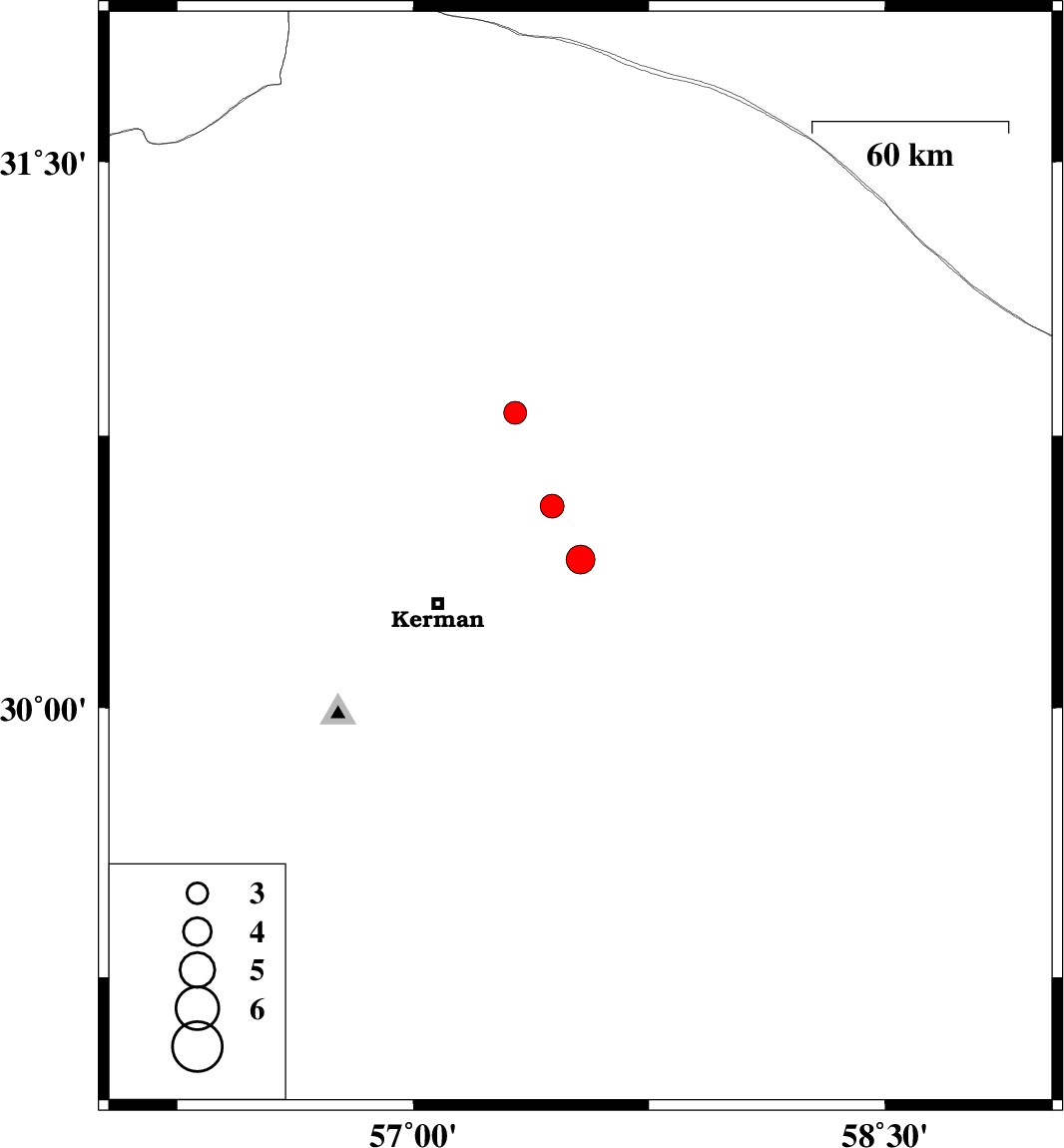 | 2021/11/09 | 19:31:53.1 | 23:01:53.1 | 30.409 | 57.532 | 12 | ML4.1 | Kerman Province, 46 km North-East of Kerman | ||