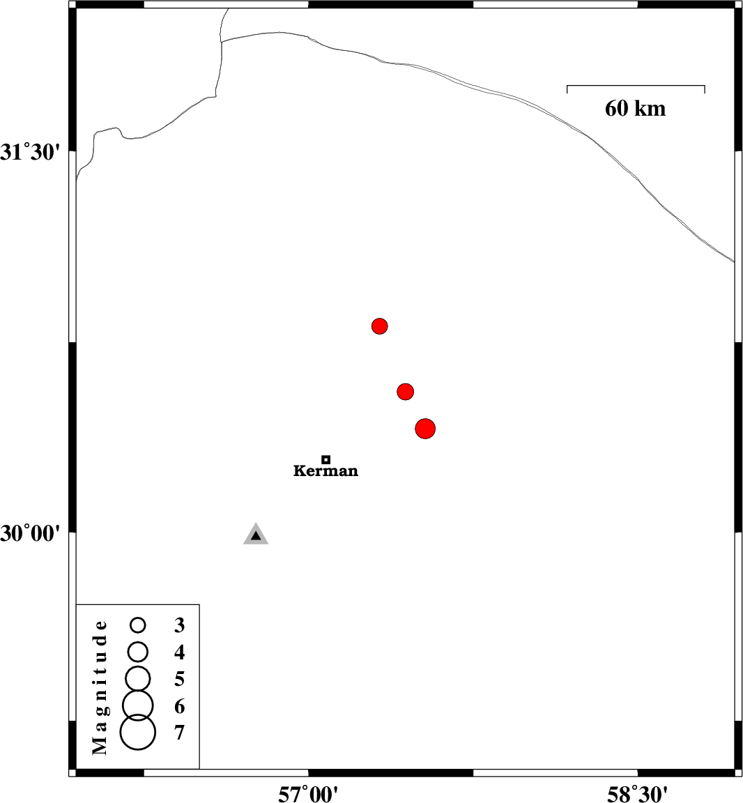 | 2021/11/09 | 19:31:53.1 | 23:01:53.1 | 30.409 | 57.532 | 12 | ML4.1 | Kerman Province, 46 km North-East of Kerman | ||