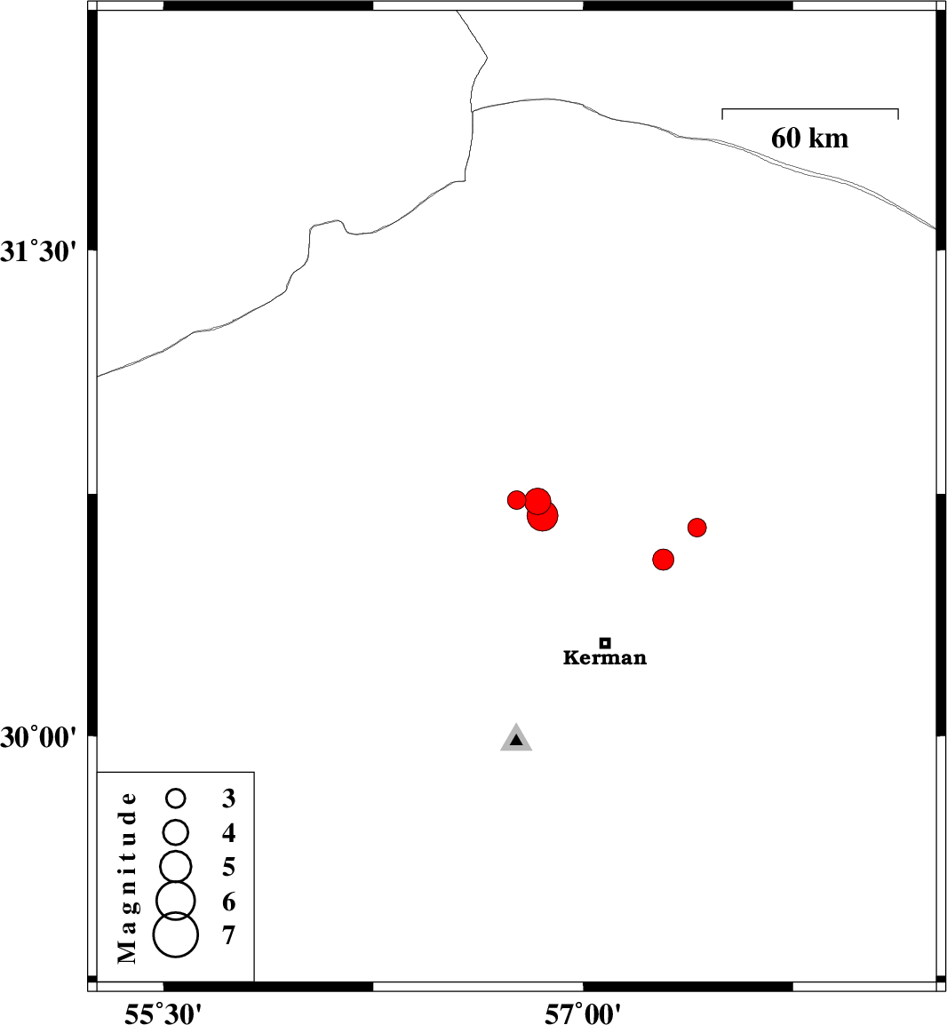 | 2021/11/28 | 17:52:01.4 | 21:22:01.4 | 30.546 | 57.286 | 7 | ML3.4 | Kerman Province, 35 km North-East of Kerman |