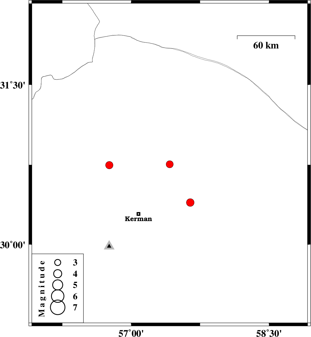 | 2021/12/29 | 07:24:23.1 | 10:54:23.1 | 30.396 | 57.643 | 12 | ML3.8 | Kerman Province, 55 km North-East of Kerman |