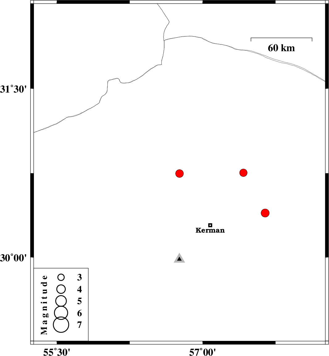 | 2021/12/29 | 07:24:23.1 | 10:54:23.1 | 30.396 | 57.643 | 12 | ML3.8 | Kerman Province, 55 km North-East of Kerman |