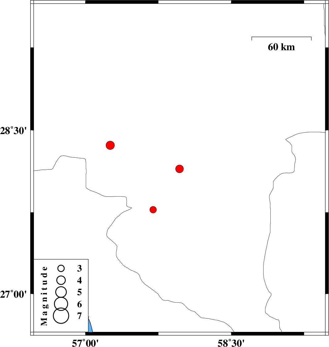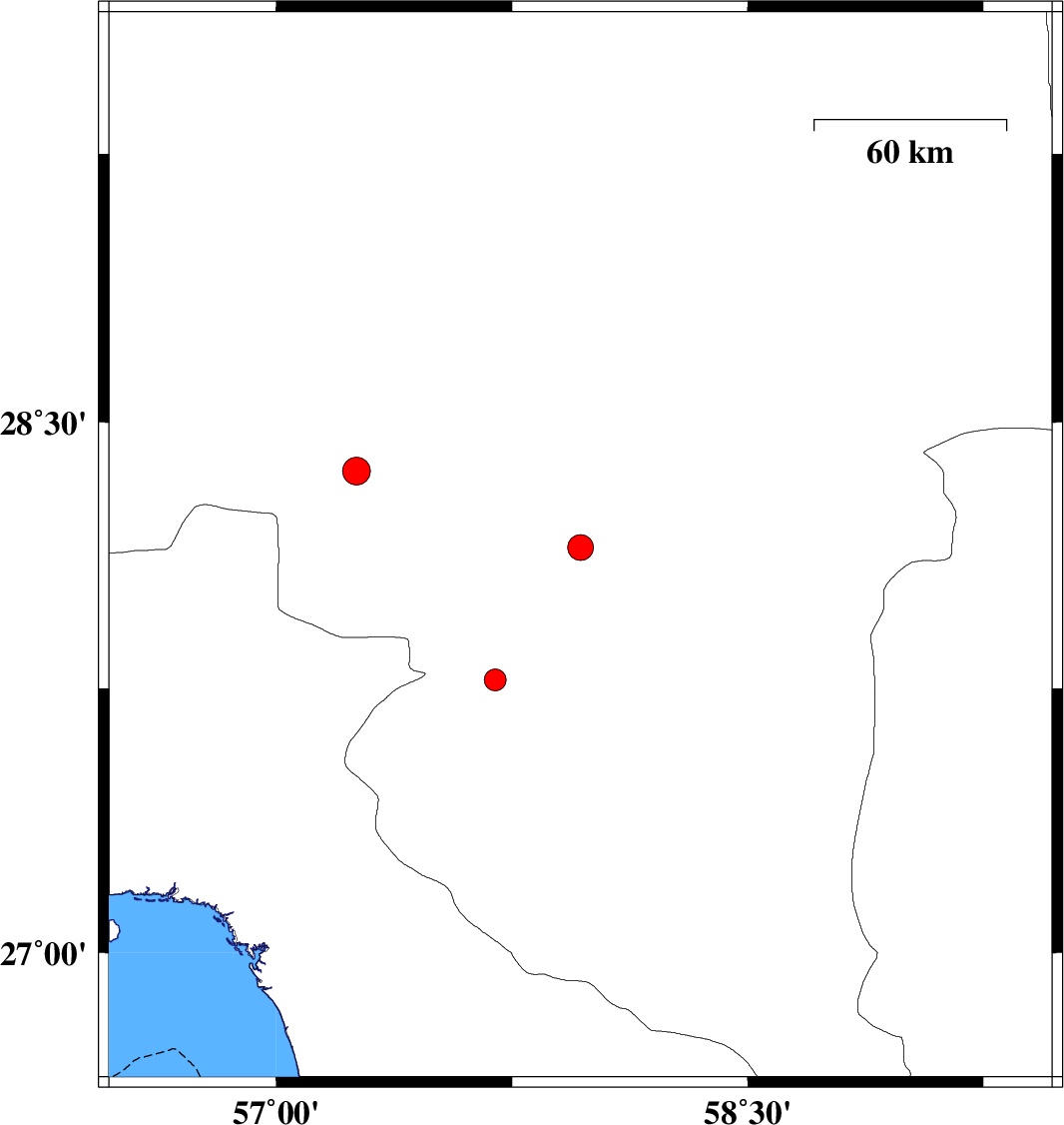 | 2022/01/08 | 20:42:16.7 | 00:12:16.7 | 27.774 | 57.697 | 12 | ML3.1 | Kerman Province, 20 km South of Kahnuj |