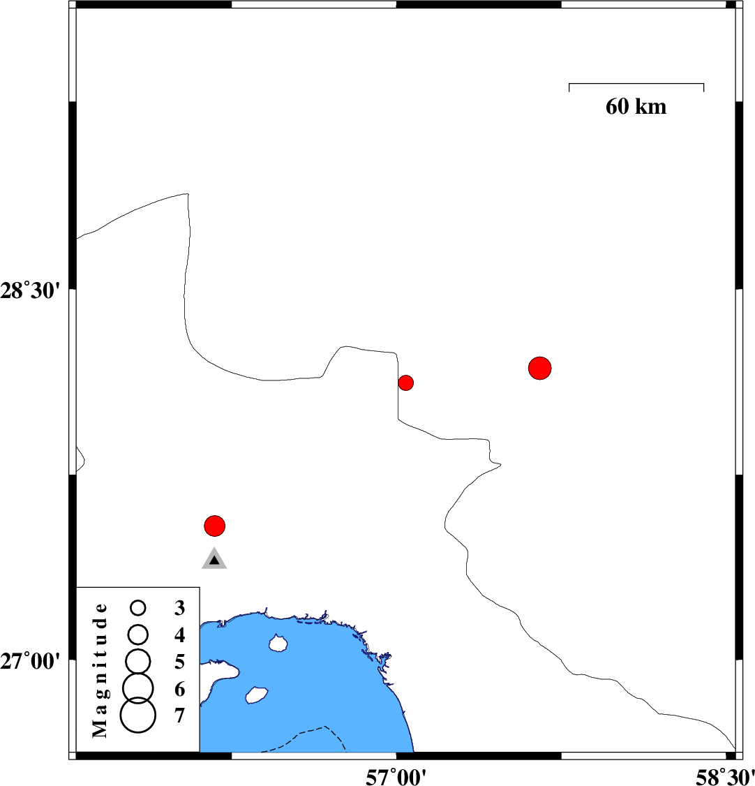 | 2022/03/02 | 03:06:59.3 | 06:36:59.3 | 28.181 | 57.651 | 10 | ML4.6 | Kerman Province, 26 km North of Kahnuj |