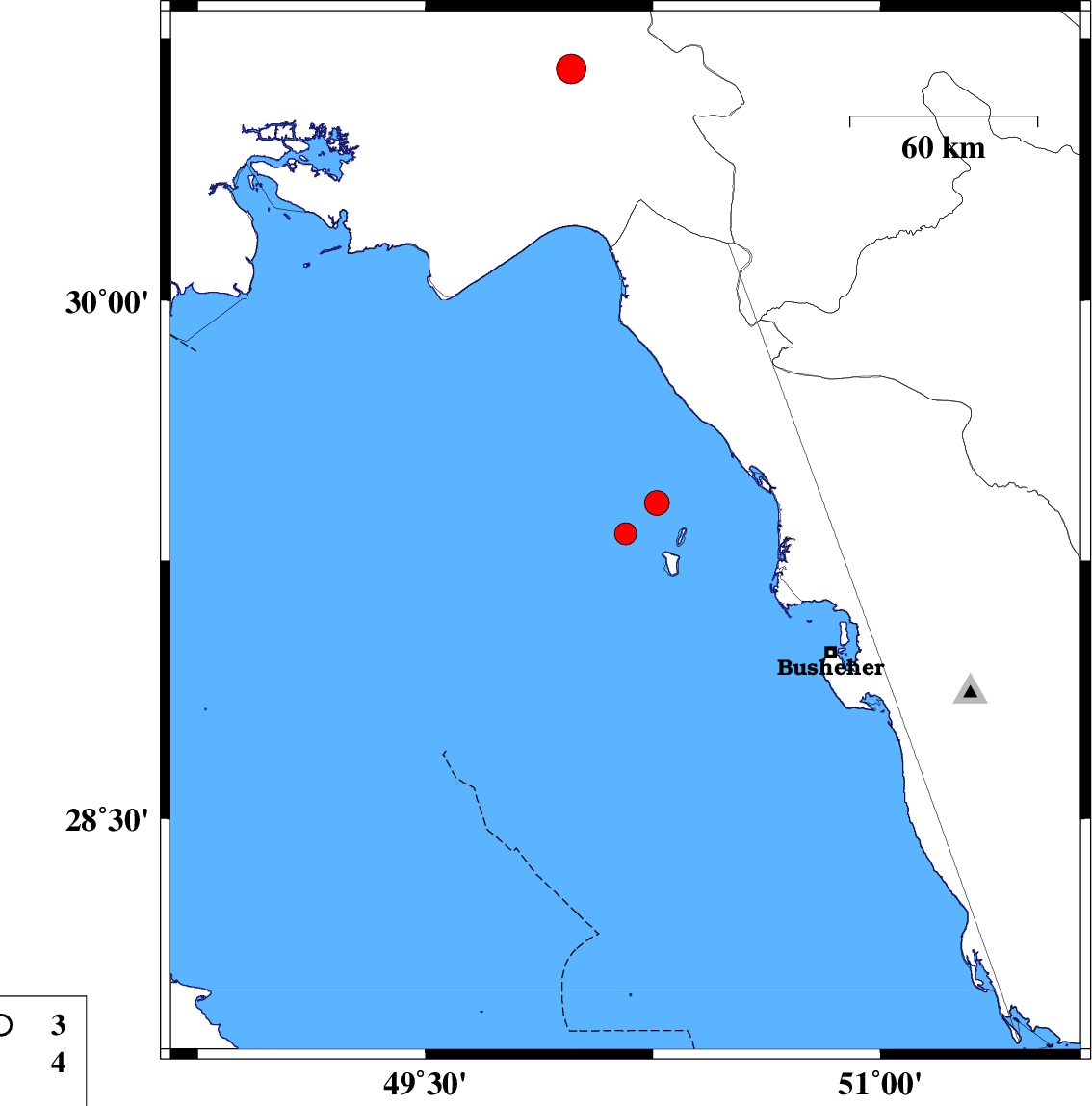 | 2022/04/11 | 08:43:44.6 | 13:13:44.6 | 29.328 | 50.16 | 9 | ML3.3 | Persian Gulf, 44 km South-West of Bandar-e genaveh | ||