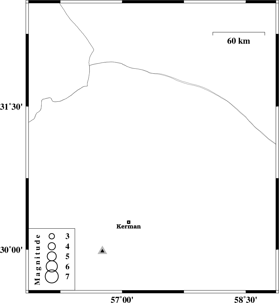 | 2022/04/25 | 17:41:59.8 | 22:11:59.8 | 31.068 | 57.365 | 12 | ML3.1 | Kerman Province, 57 km South-East of Ravar |