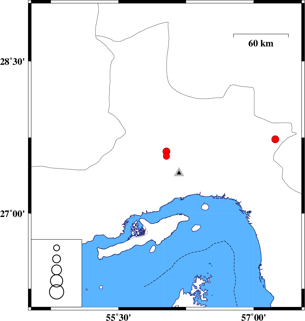 | 2022/04/27 | 19:30:12.2 | 00:00:12.2 | 27.732 | 57.24 | 14 | ML3.7 | Hormozgan Province, 34 km North of Dehbarez | ||