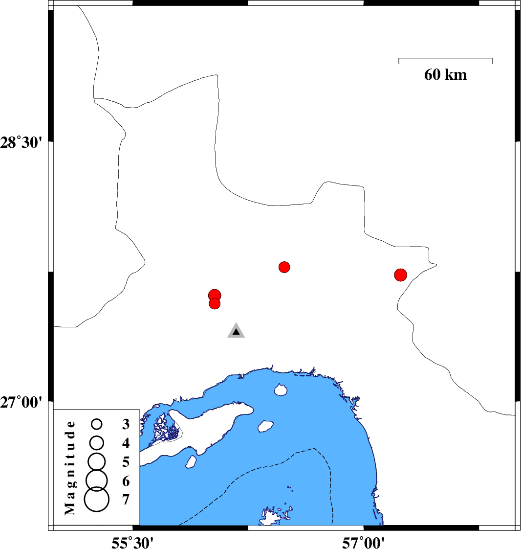 | 2022/04/27 | 03:03:09.6 | 07:33:09.6 | 27.566 | 56.032 | 12 | ML3.3 | Hormozgan Province, 49 km North-West of Bandar-e abbas | ||