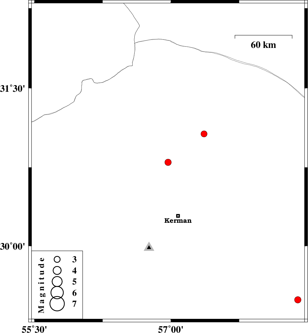 | 2022/04/25 | 17:41:59.8 | 22:11:59.8 | 31.068 | 57.365 | 12 | ML3.1 | Kerman Province, 57 km South-East of Ravar | ||