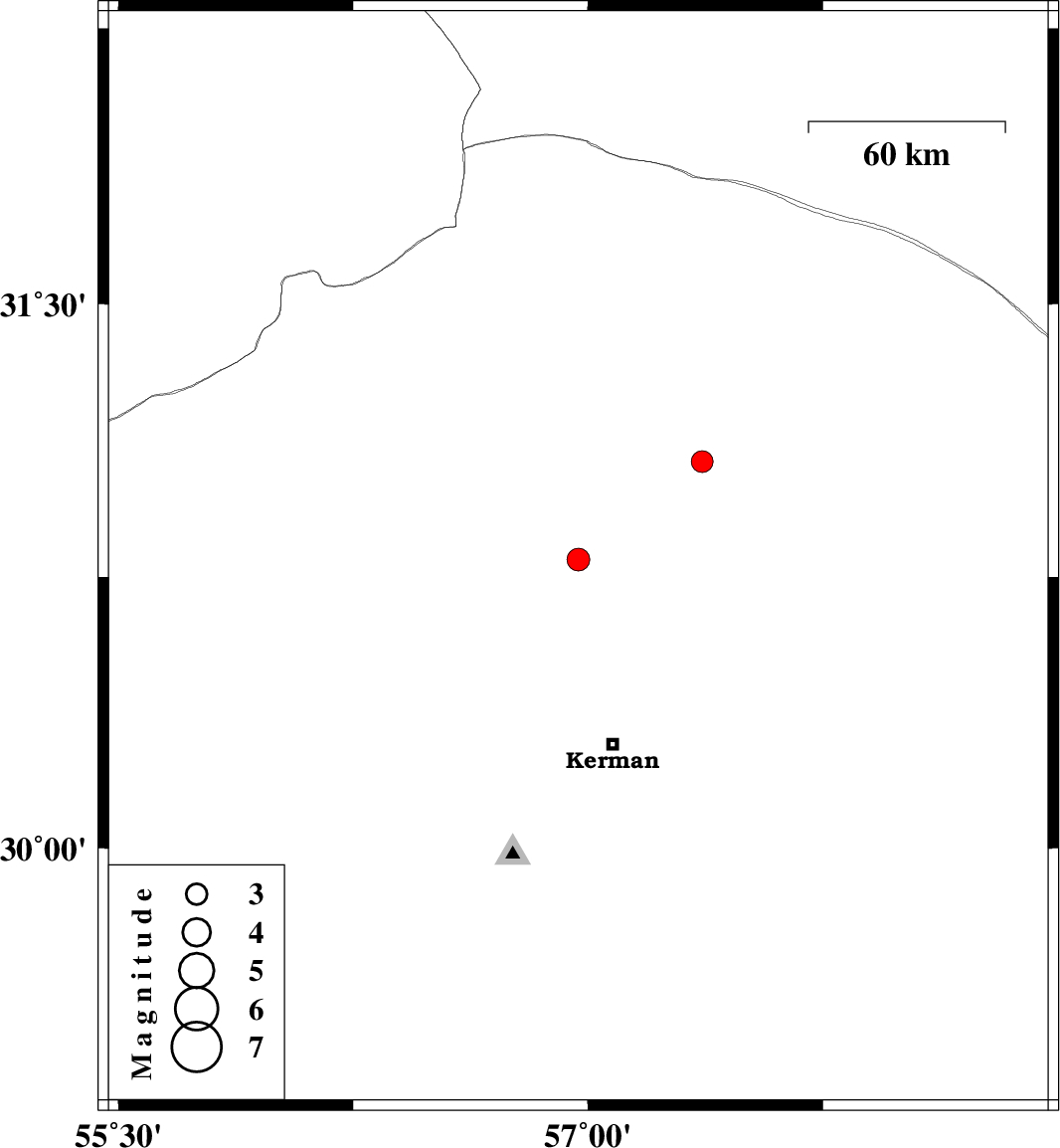 | 2022/04/25 | 17:41:59.8 | 22:11:59.8 | 31.068 | 57.365 | 12 | ML3.1 | Kerman Province, 57 km South-East of Ravar |