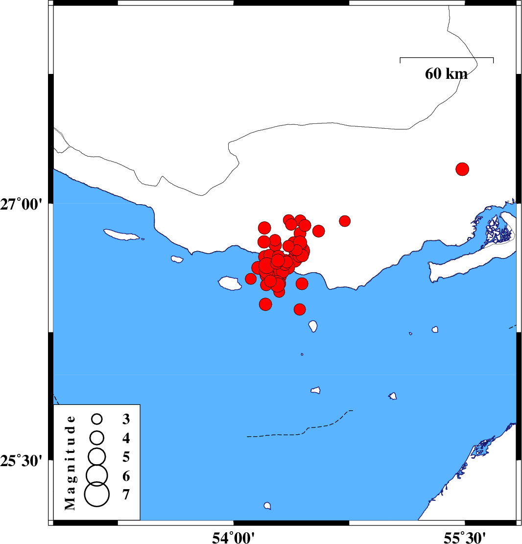 2022/06/16 00:40:46.7 05:10:46.7 26.63854.21512 ML4.7 Persian Gulf, 64 km South-West of Bastak