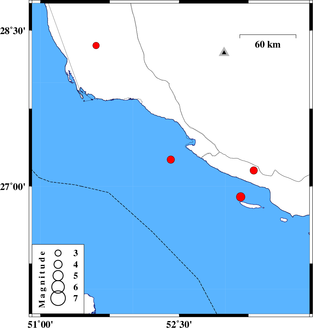 | 2022/07/23 | 10:51:54.5 | 15:21:54.5 | 28.356 | 51.602 | 12 | ML3.3 | Bushehr Province, 40 km South-East of Khormog | ||