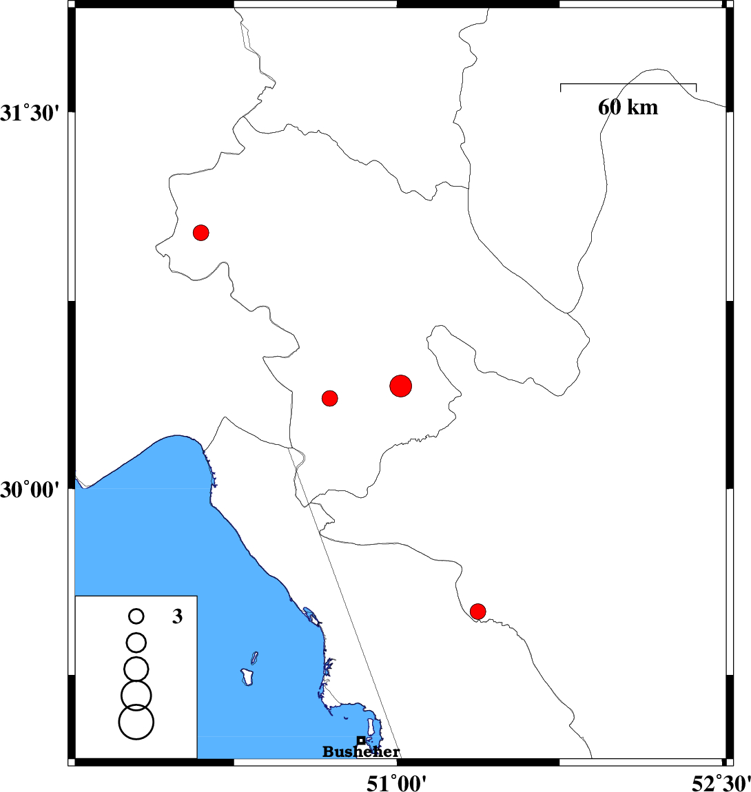 | 2022/10/02 | 05:15:10.5 | 08:45:10.5 | 29.506 | 51.373 | 12 | ML3.3 | Fars Province, 30 km South-West of Kazerun | ||