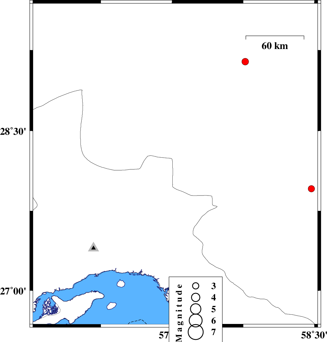 | 2022/10/23 | 13:00:29.9 | 16:30:29.9 | 28.424 | 57.608 | 12 | ML3.7 | Kerman Province, 30 km South-West of Jiroft |