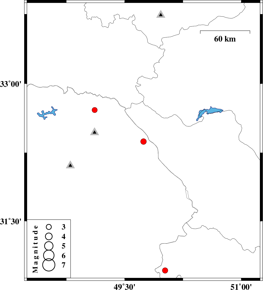 | 2022/10/28 | 09:30:50.2 | 13:00:50.2 | 32.714 | 49.114 | 10 | ML3.1 | Khoozestan Province, 36 km North of Lali | ||